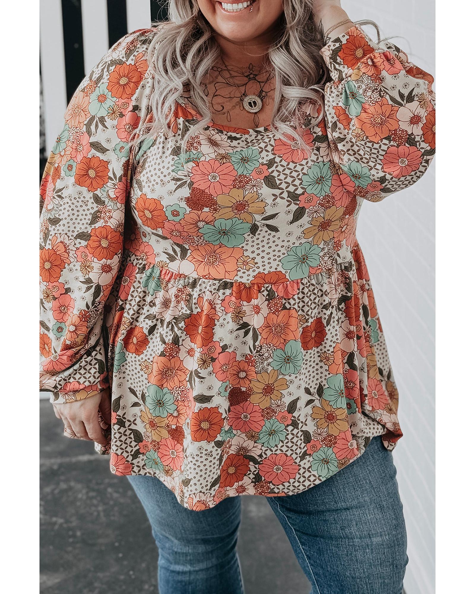Khaki Plus Size Flower Print Square Neck Peplum Blouse – 1X