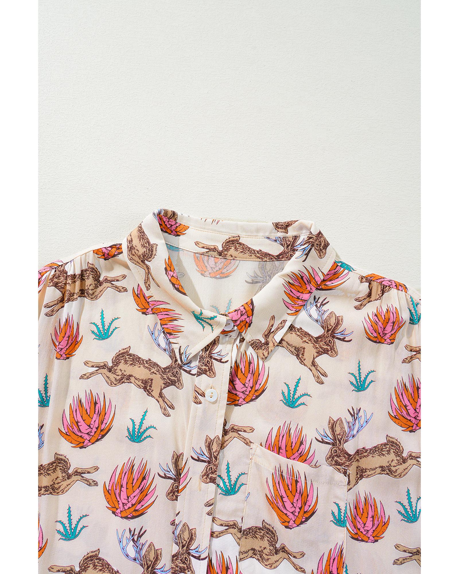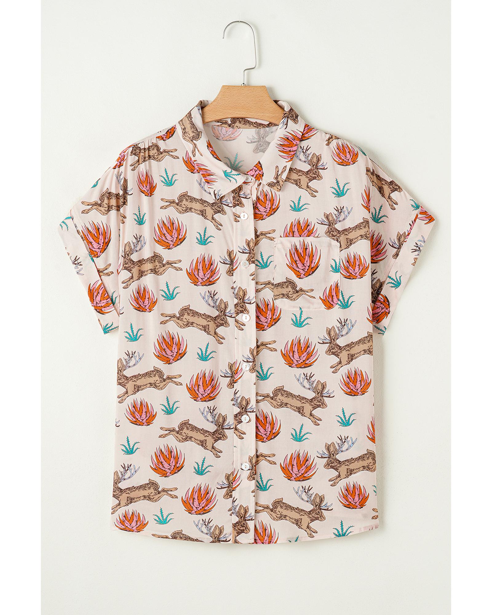 Khaki Plus Size Western Pattern Print Buttoned Short Sleeve Shirt – 1X
