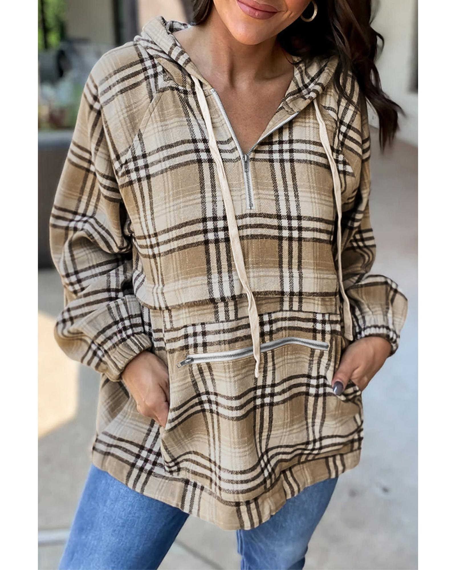 - Classic Khaki Printed Zipped Front Pullover Plaid Hoodie
