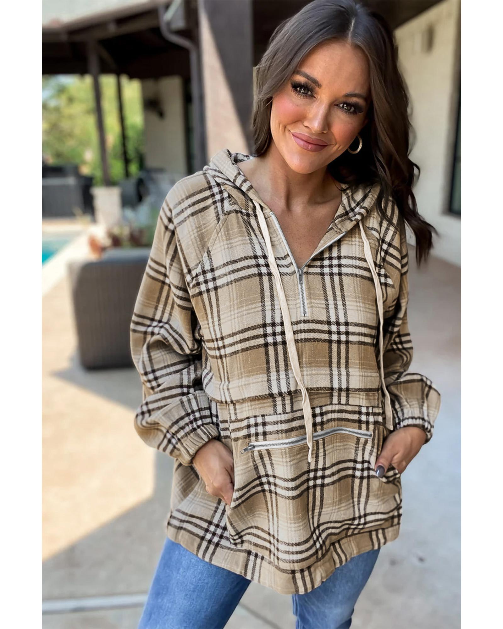 - Classic Khaki Printed Zipped Front Pullover Plaid Hoodie