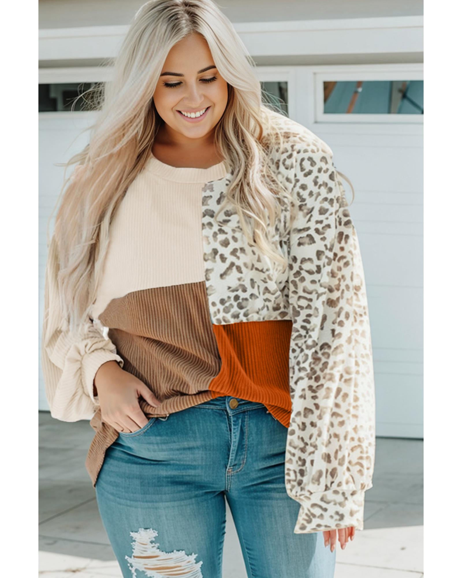 - Khaki ribbed color block leopard splicing plus size top