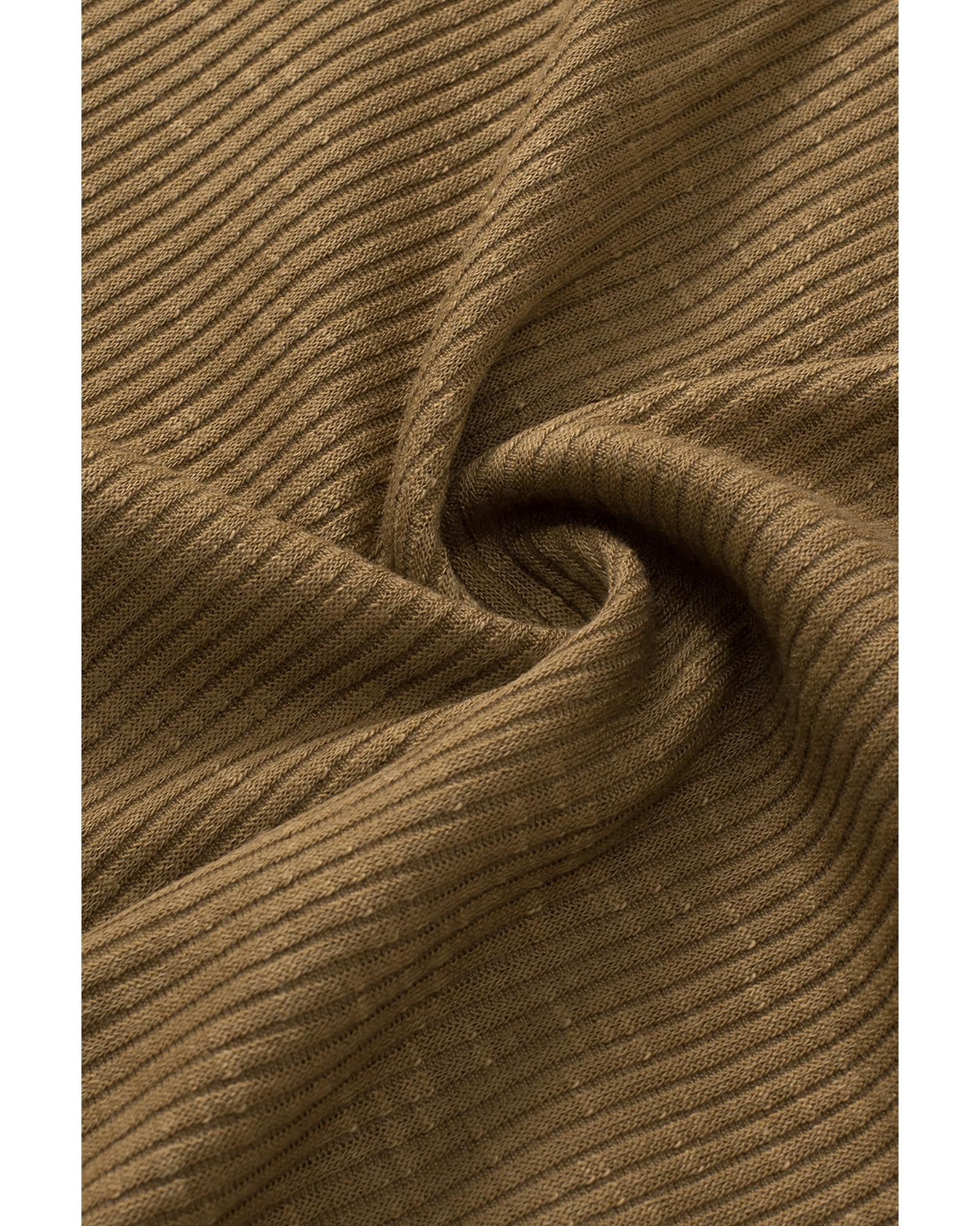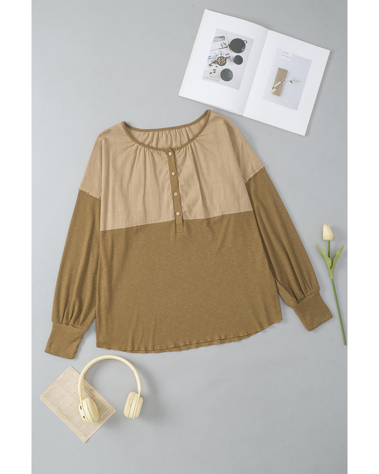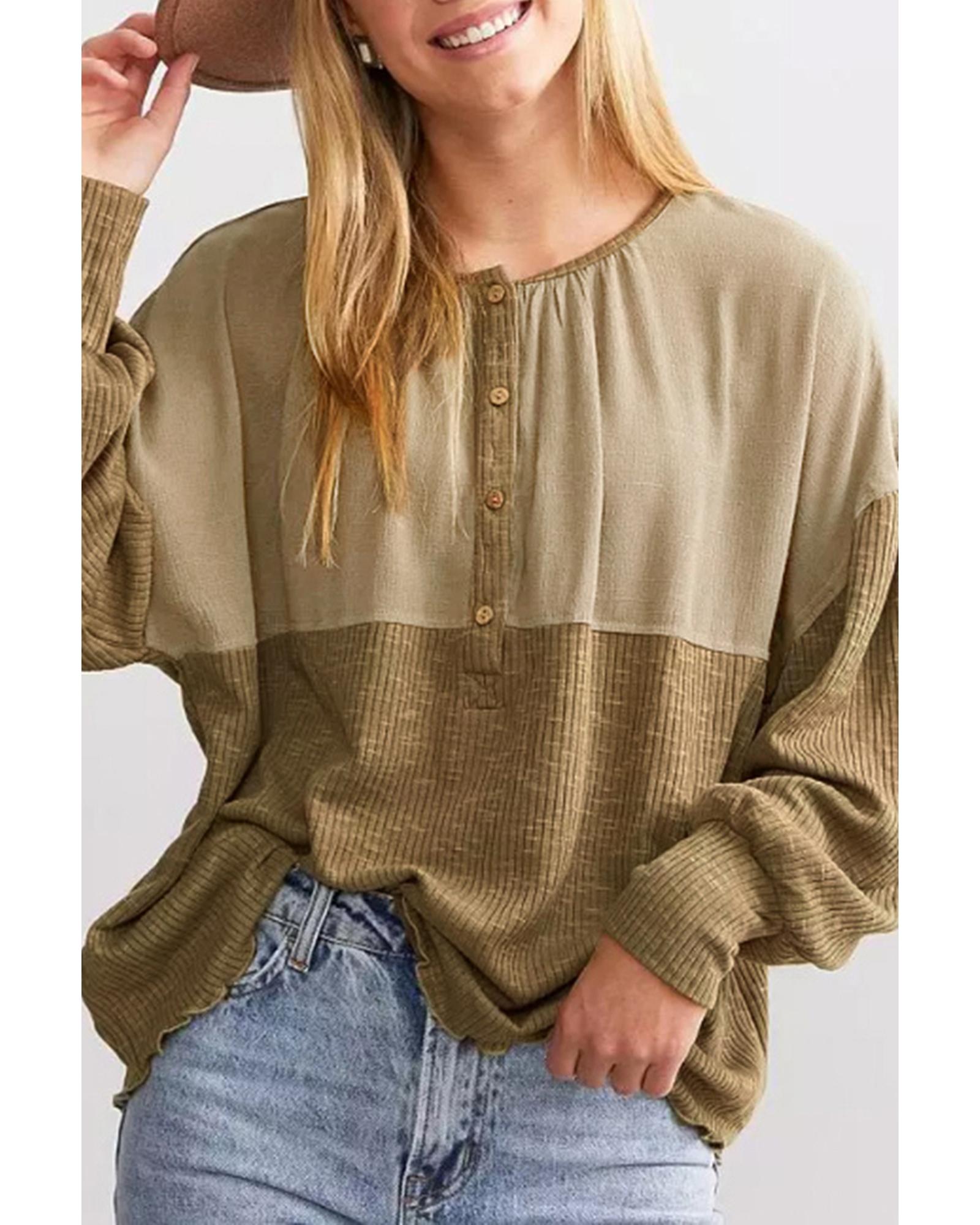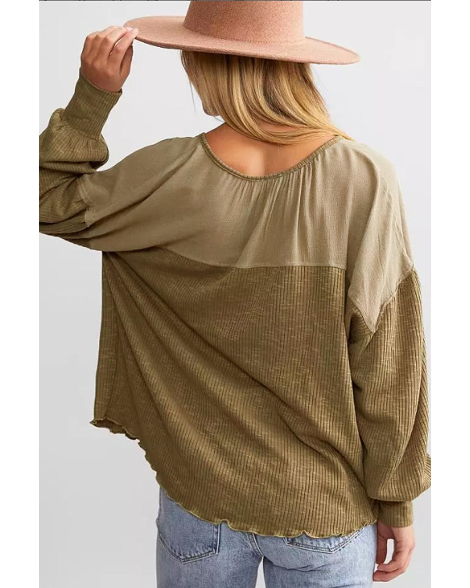 Khaki Ribbed Patchwork Drop Shoulder Buttoned Neckline Blouse – L