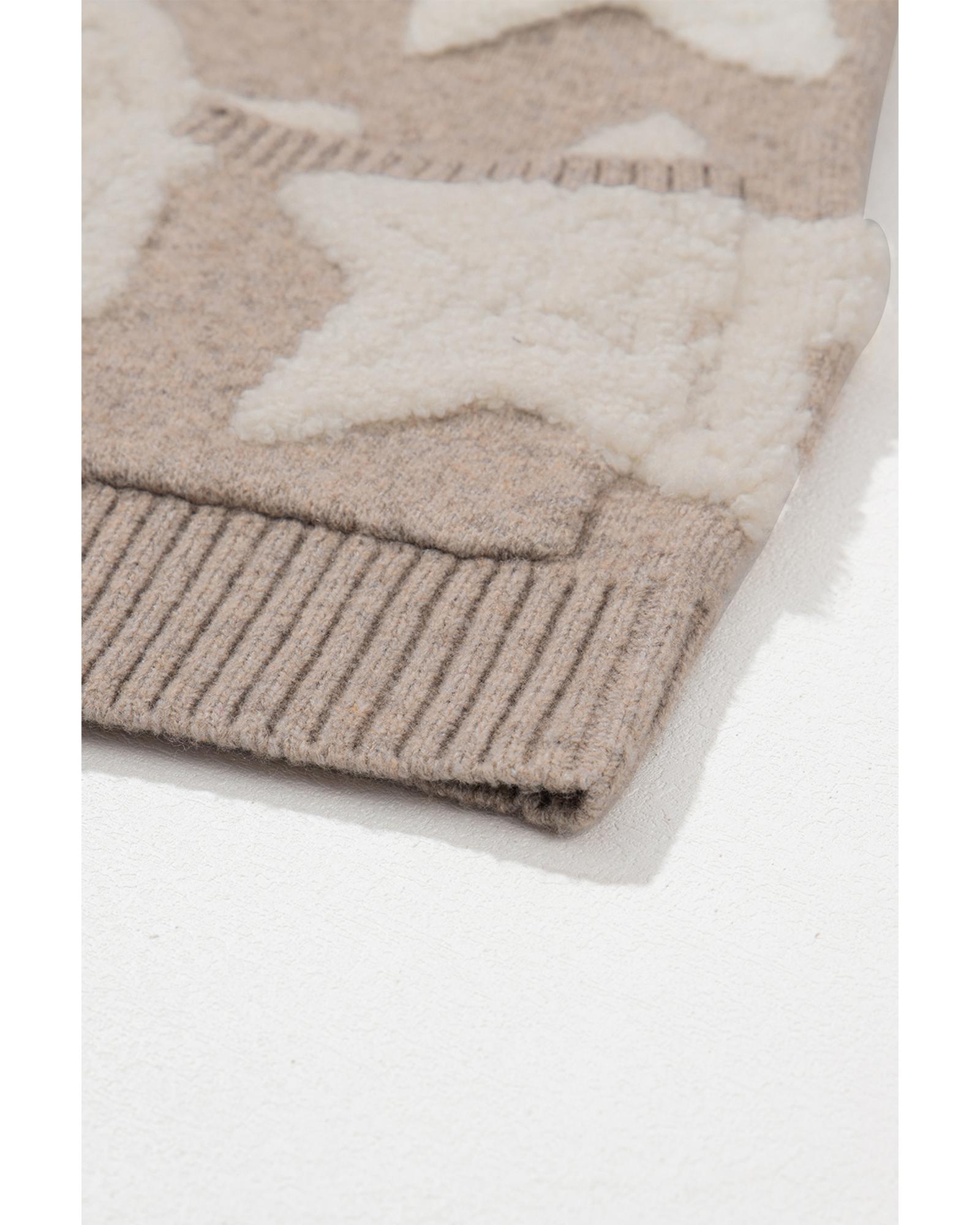 Khaki Sherpa Star Pattern Textured Sweater Cardigan with Pockets – L