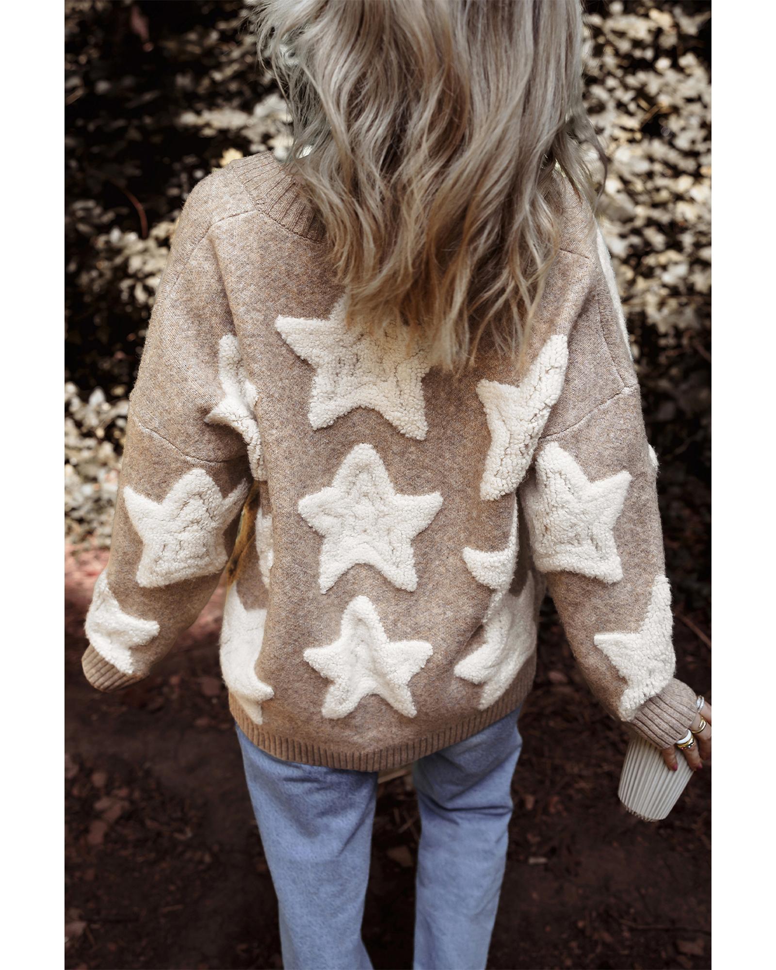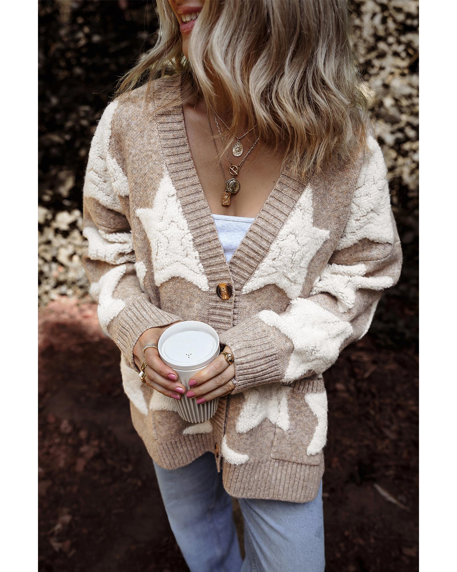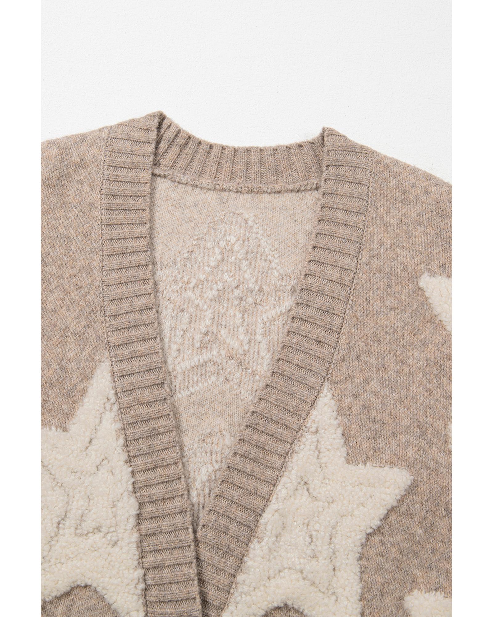 Khaki Sherpa Star Pattern Textured Sweater Cardigan with Pockets – S