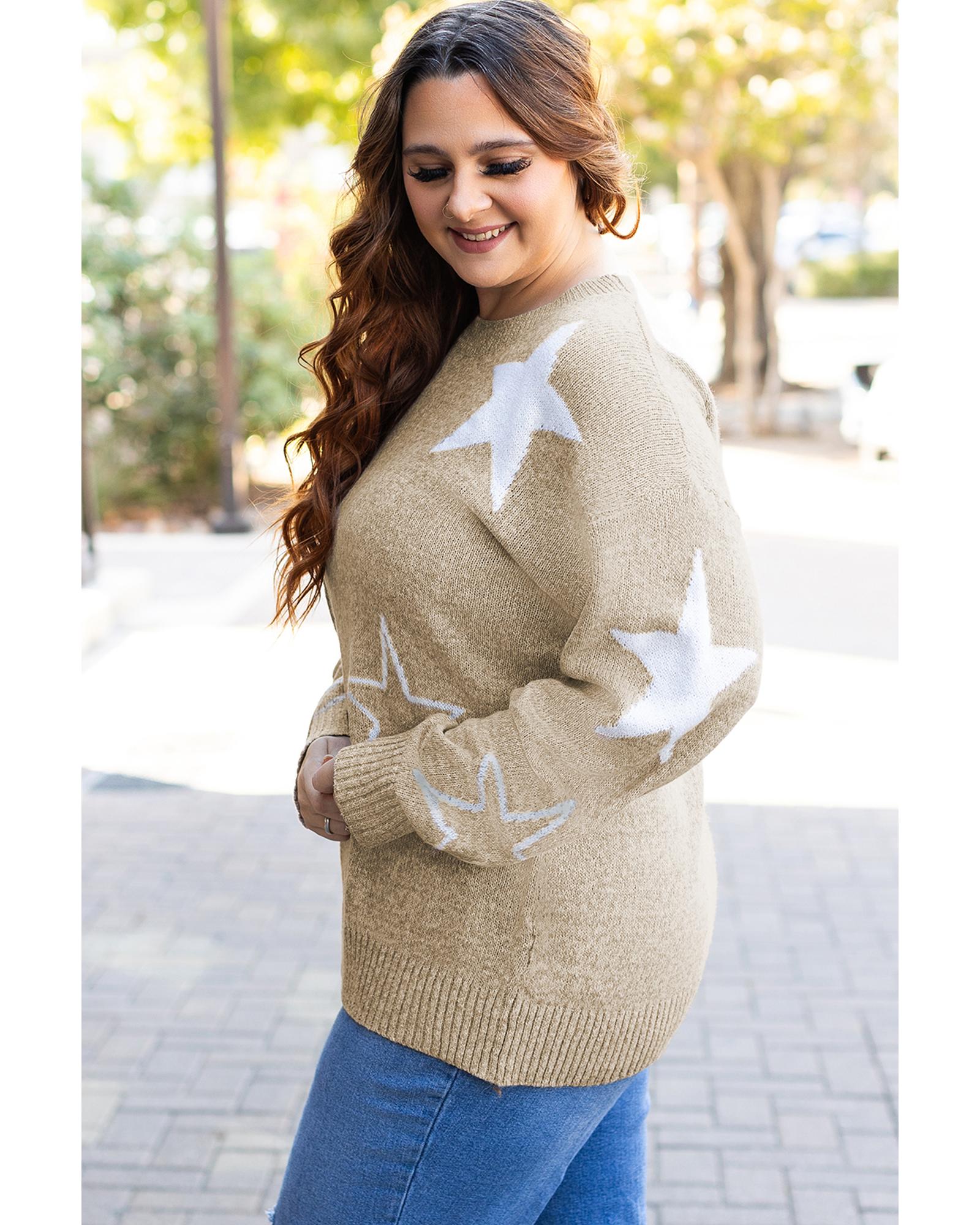 Khaki Star Pattern Drop Shoulder Plus Size Sweater – 1X