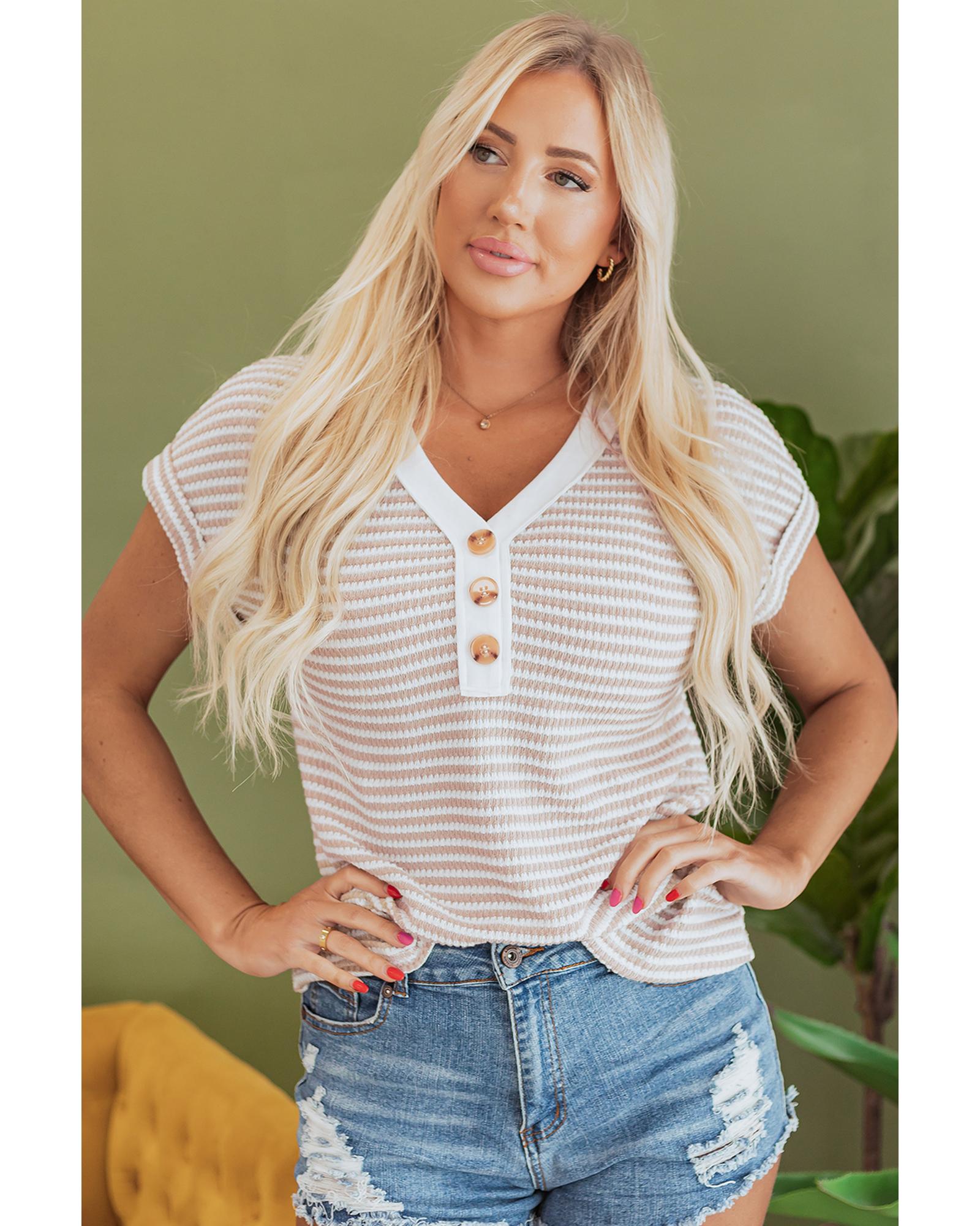 Khaki Stripe Buttoned Front V Neck Knitted T Shirt – L