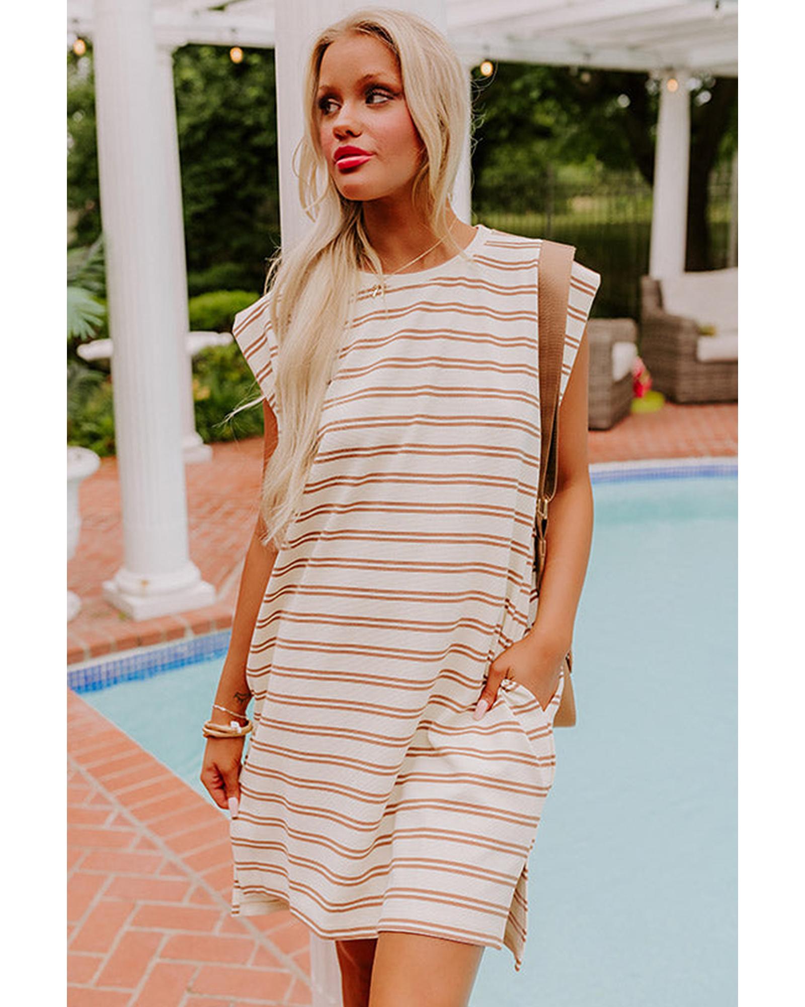 Khaki Stripe Round Neck Sleeveless Casual Pocketed Mini Dress – XL