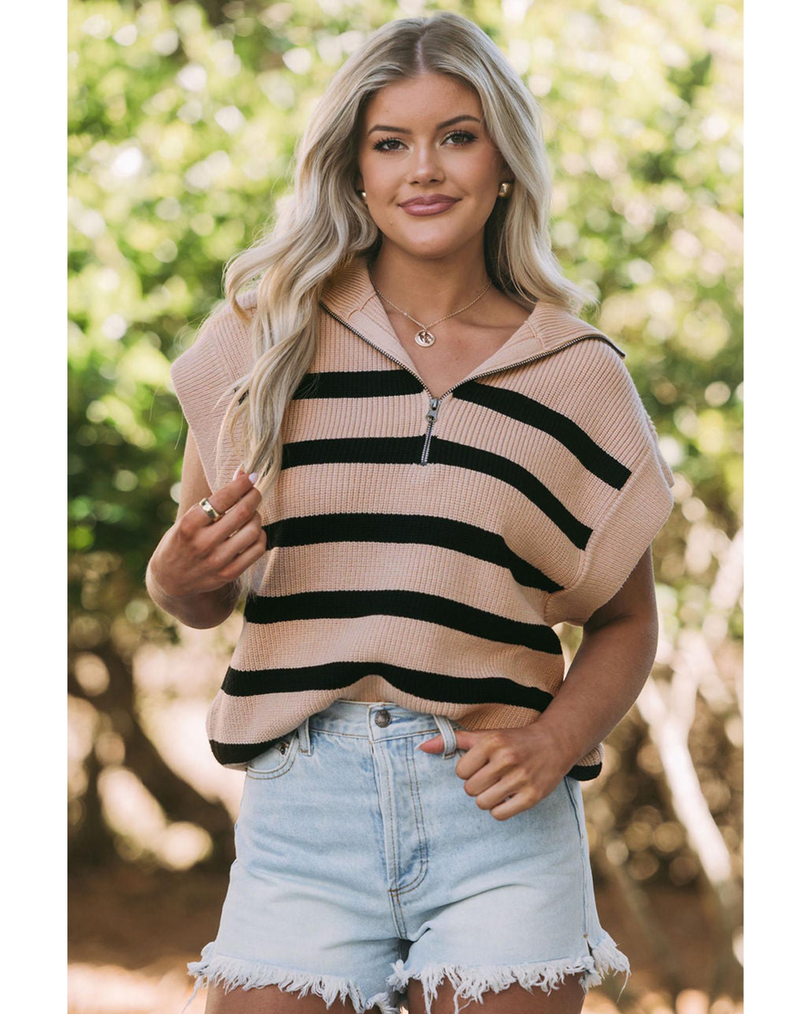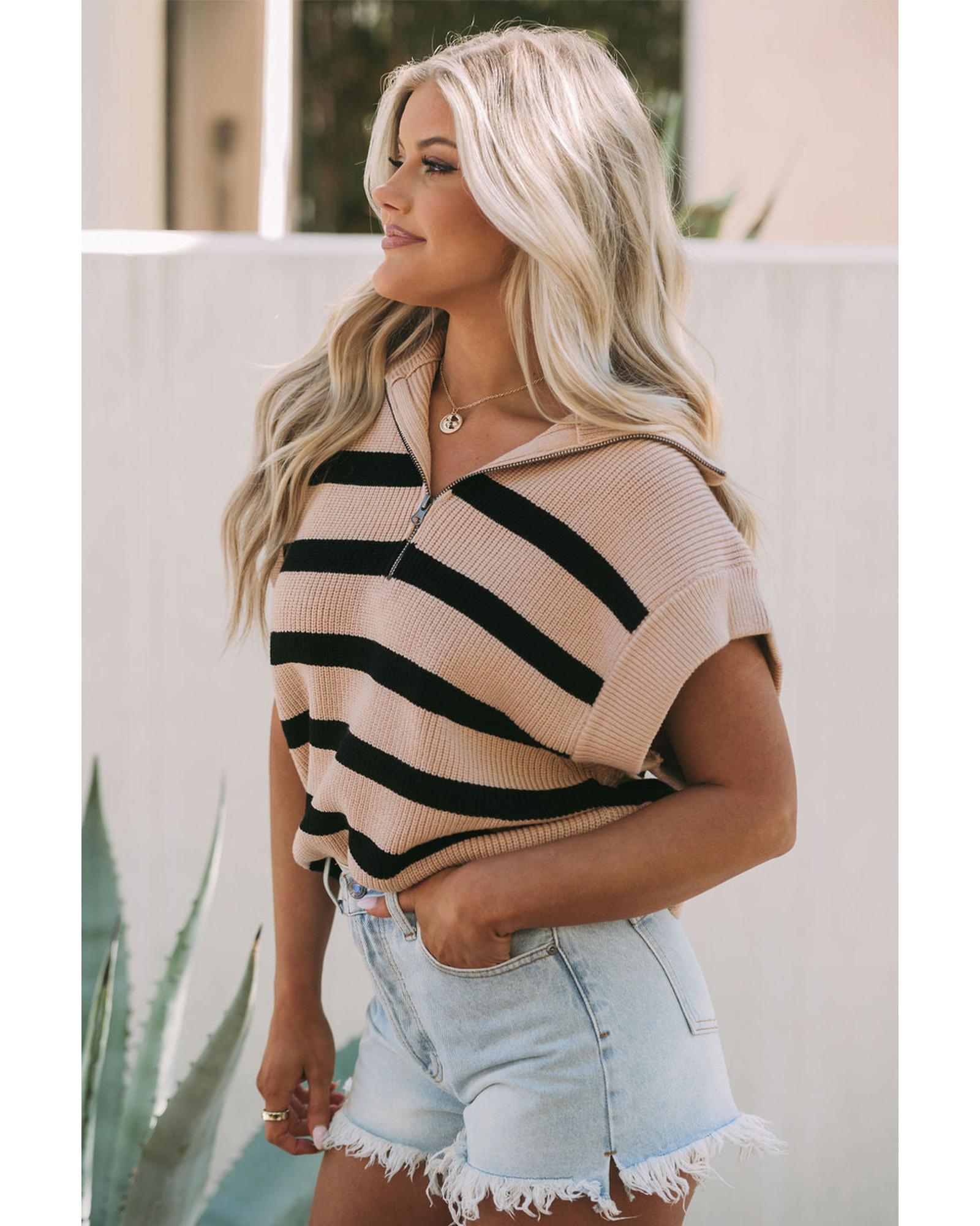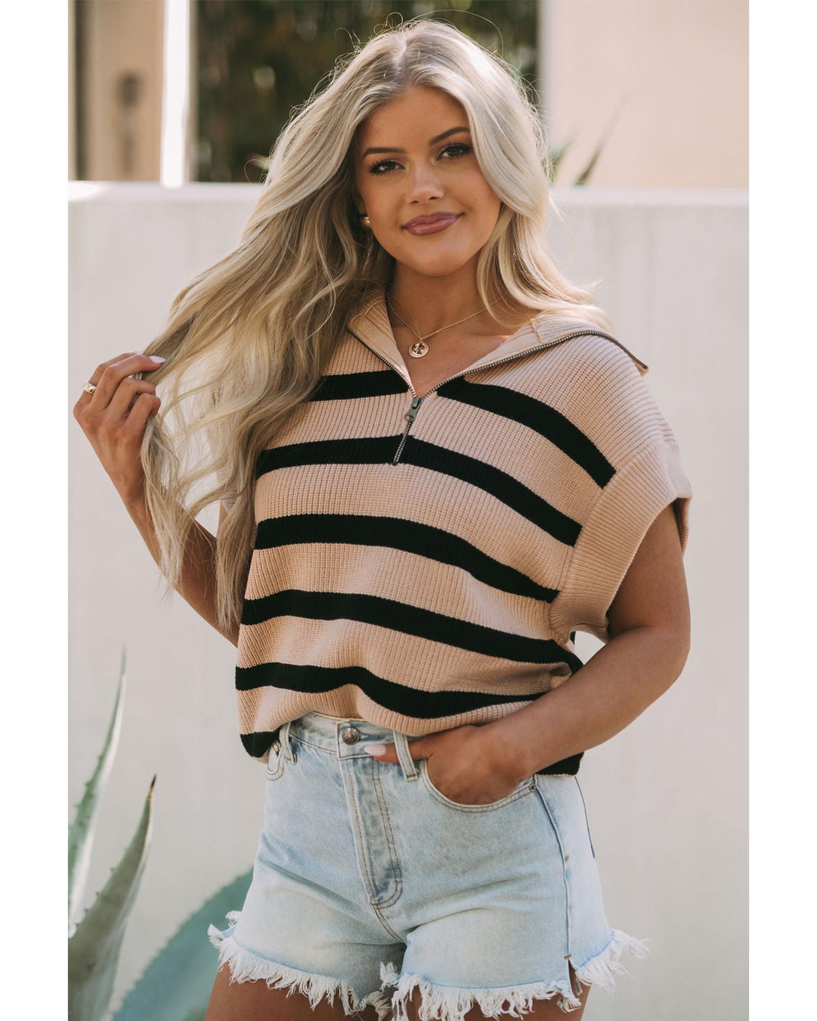 - Khaki Stripe Zipped Collar Short Sleeve Sweater