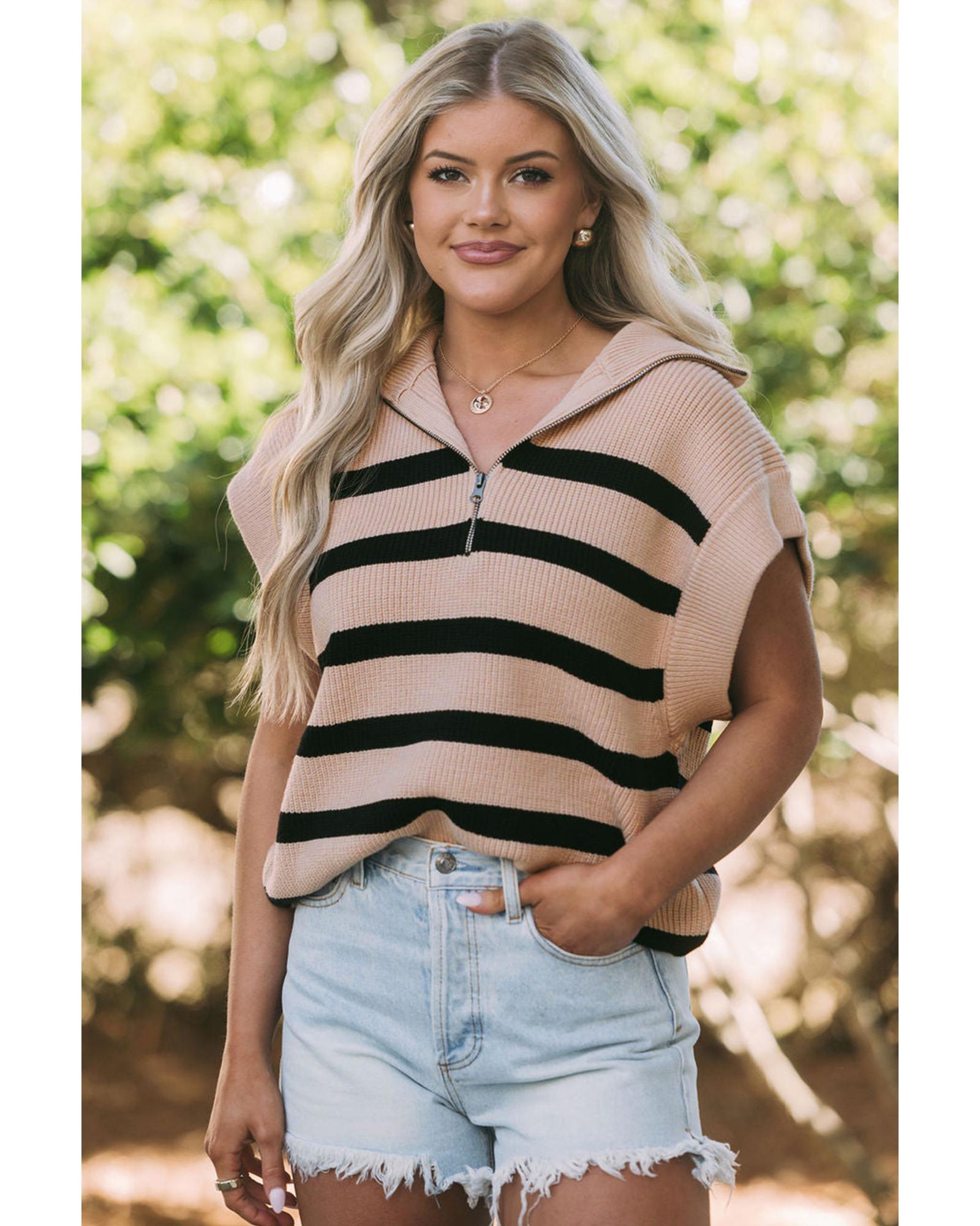 - Khaki Stripe Zipped Collar Short Sleeve Sweater