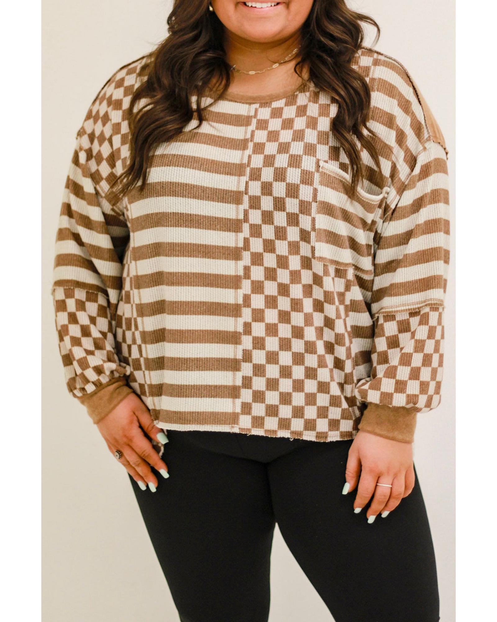 • Khaki striped checkered mixed print casual top