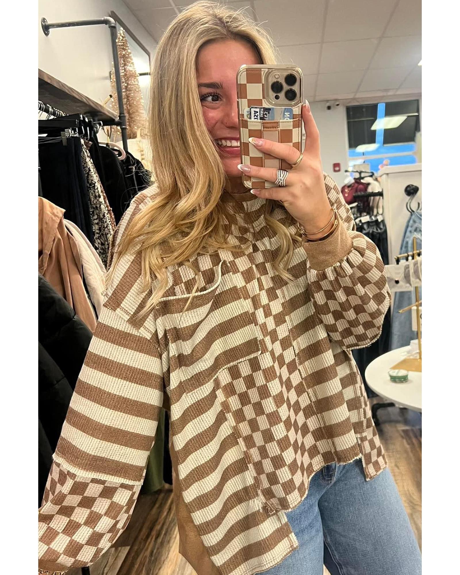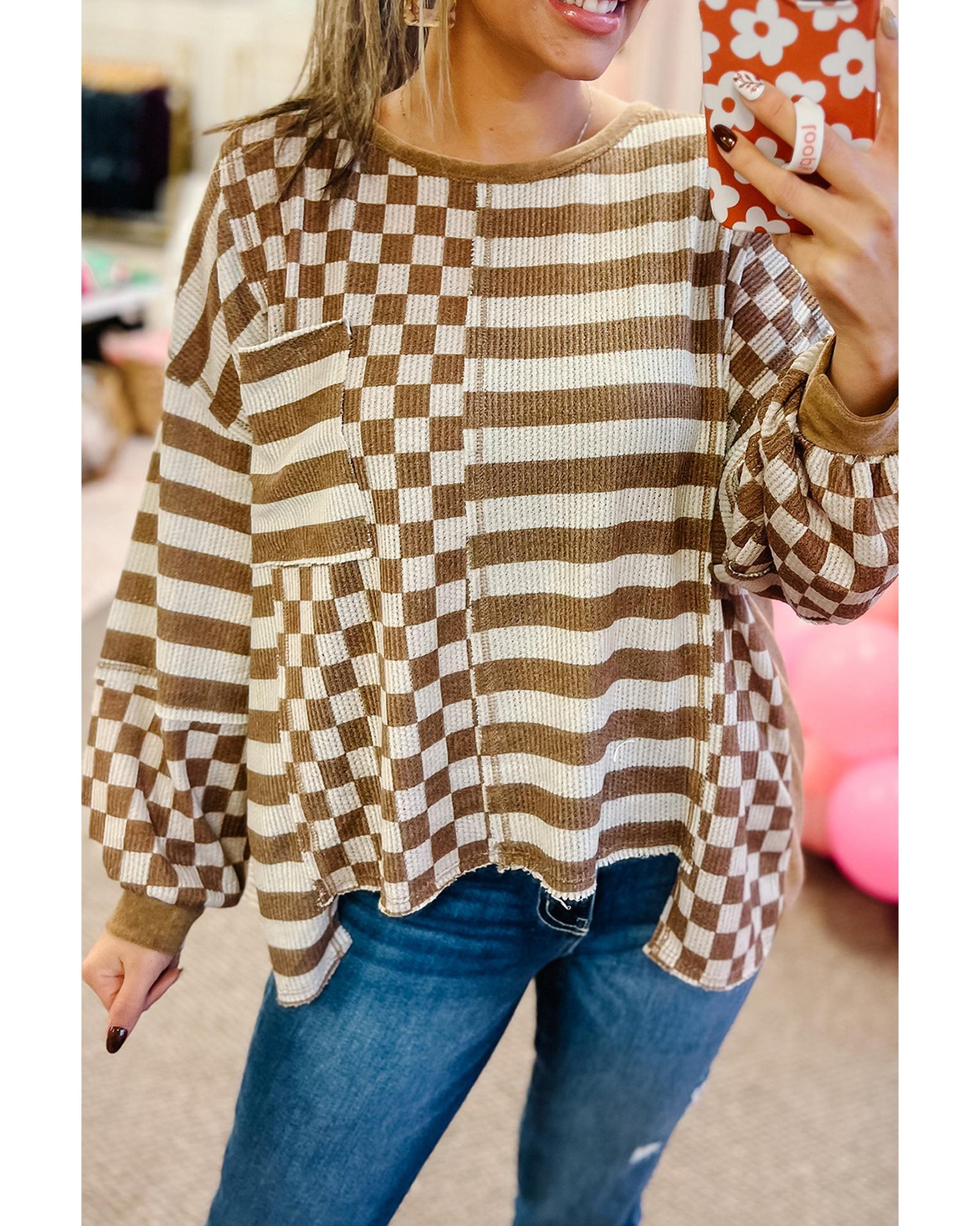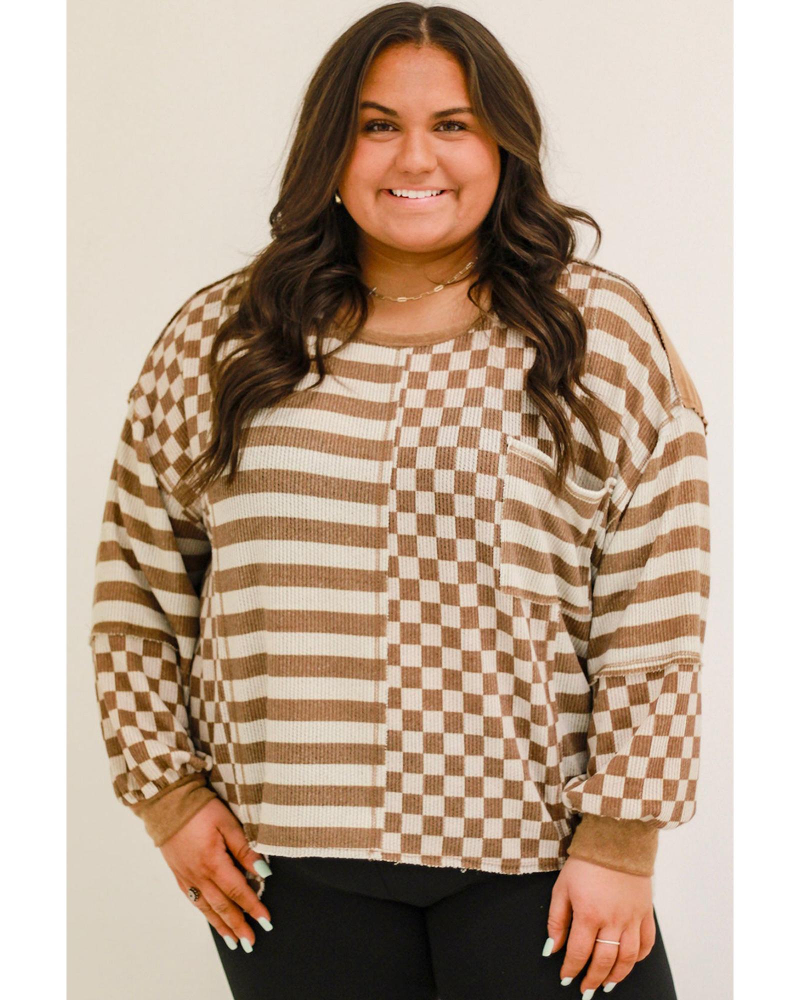 Khaki Striped Checkered Mixed Print Chest Pocket Casual Plus Size Top – 4X