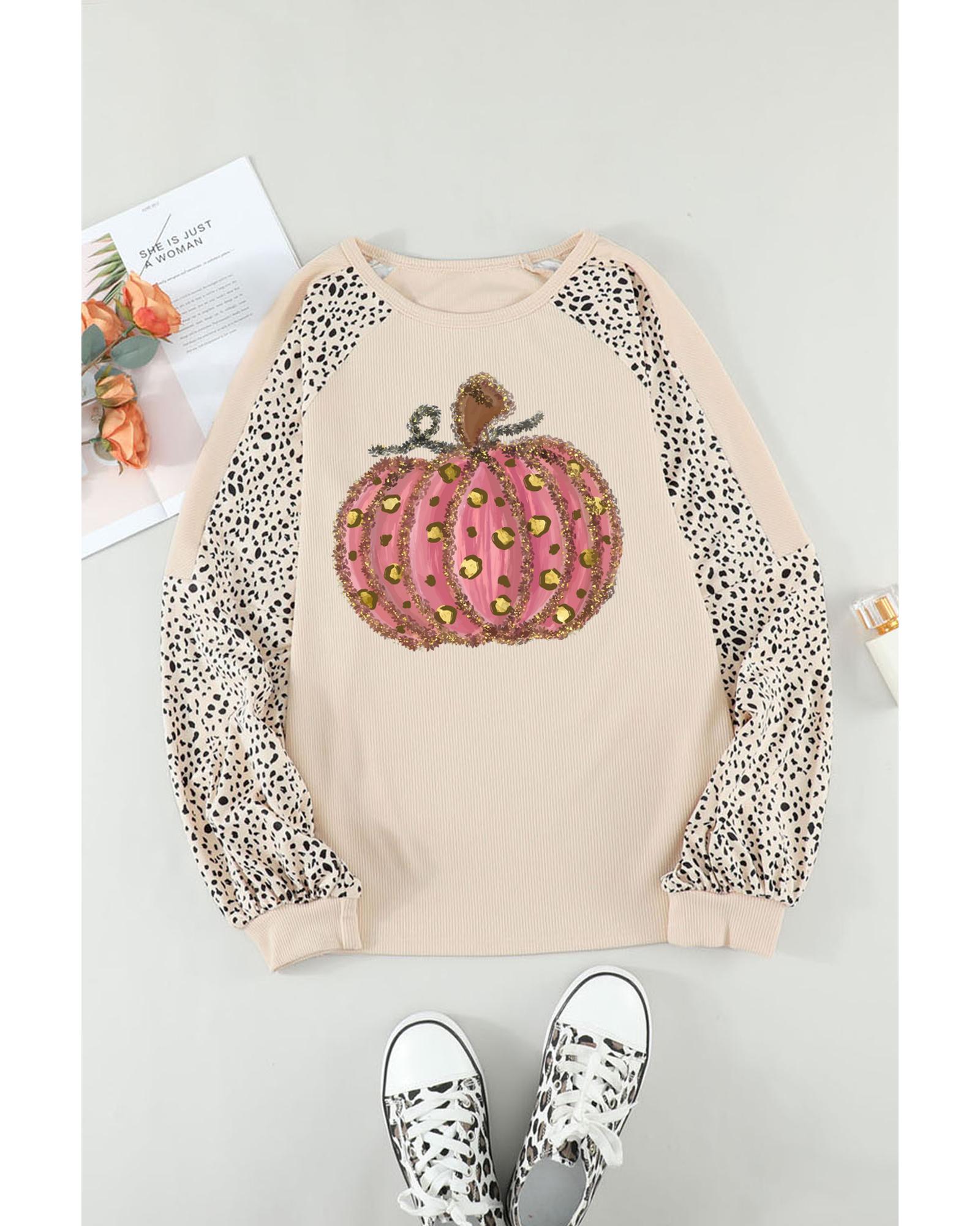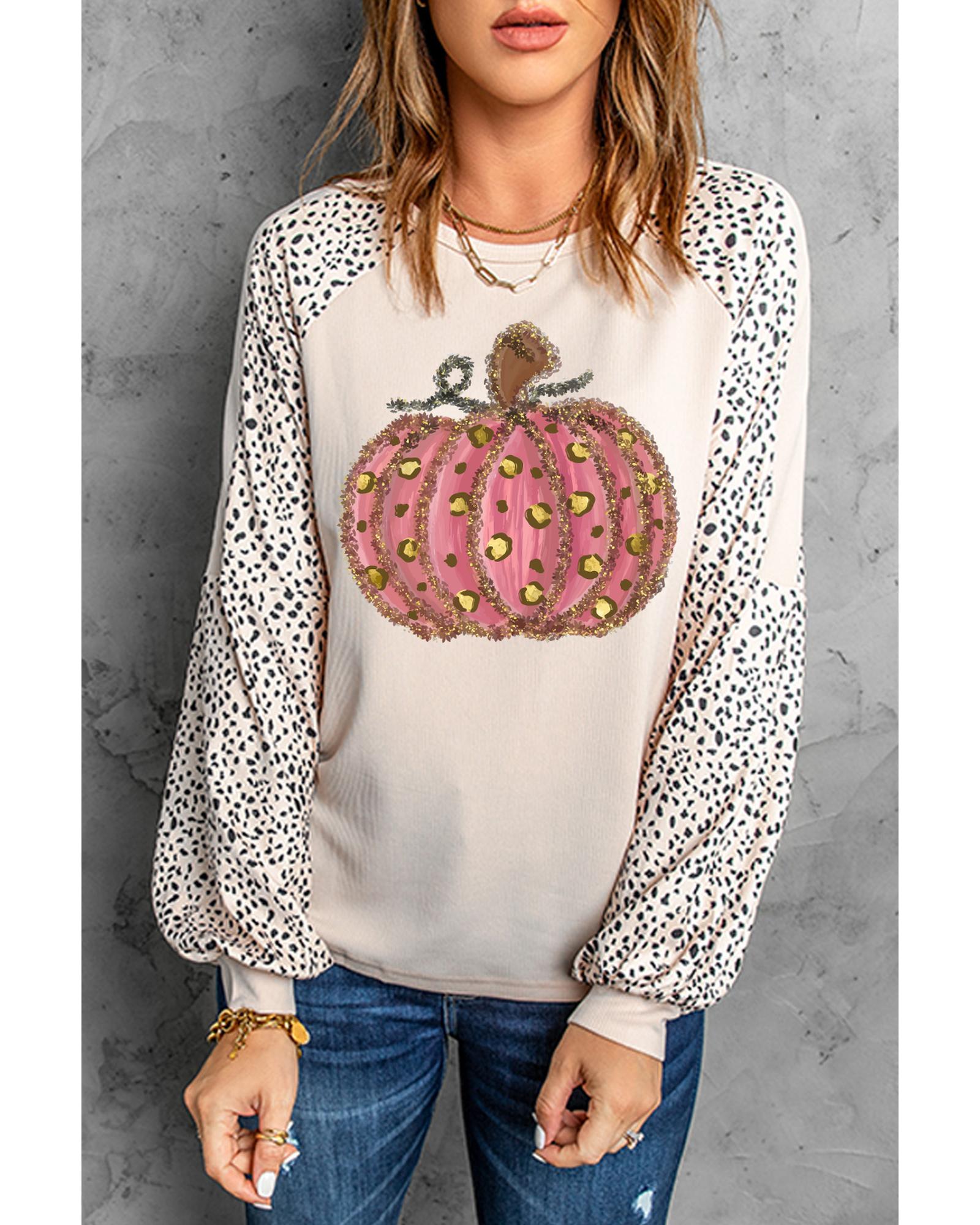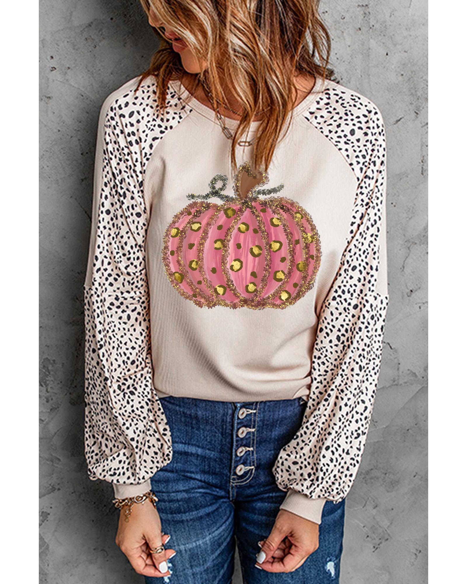 Khaki Thanksgiving Pumpkin Graphic Leopard Raglan Sleeve Top – L
