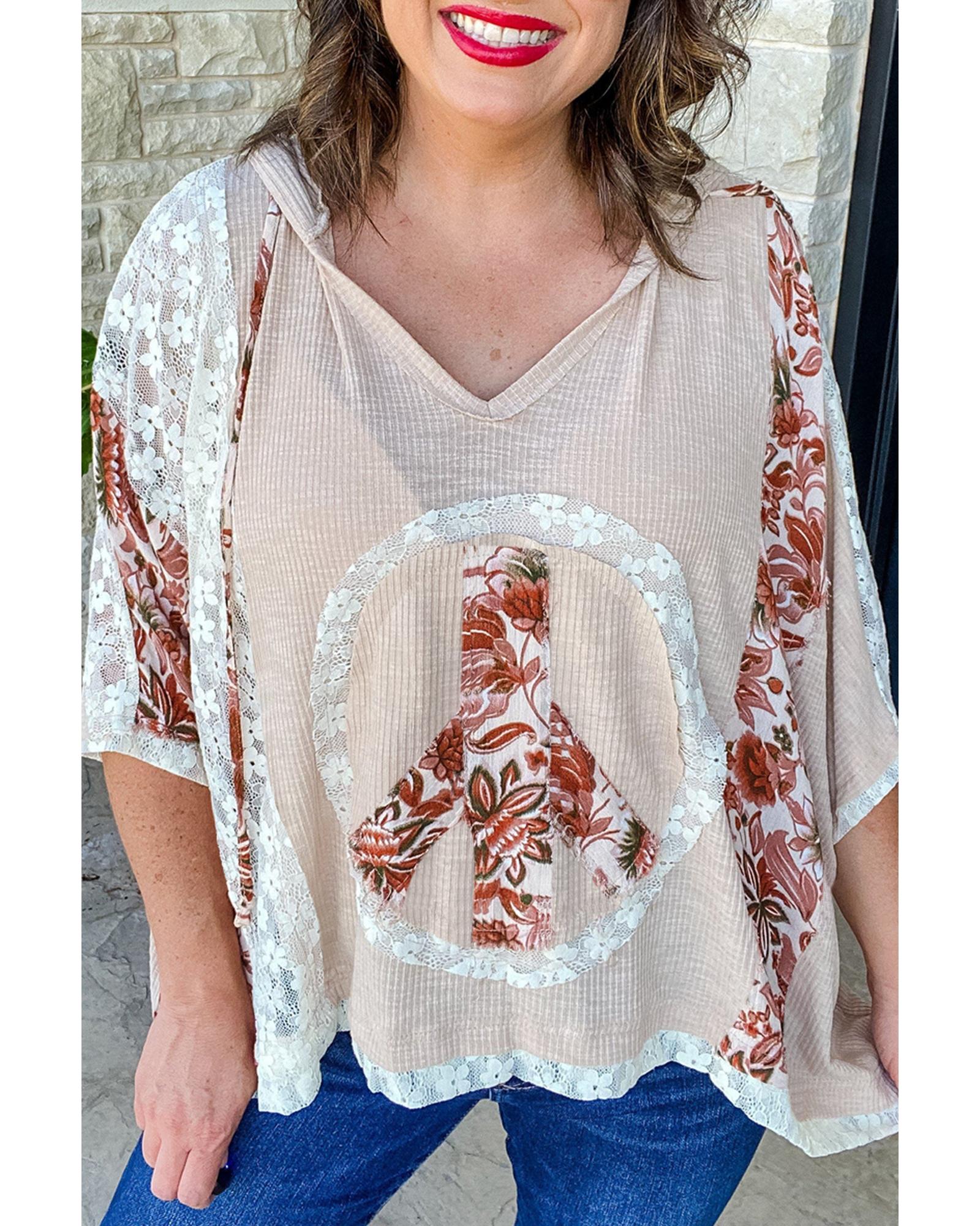 Khaki V Neck Floral Peace Sign Graphic Lace Patch Ribbed Plus Size Hooded Top – 1X