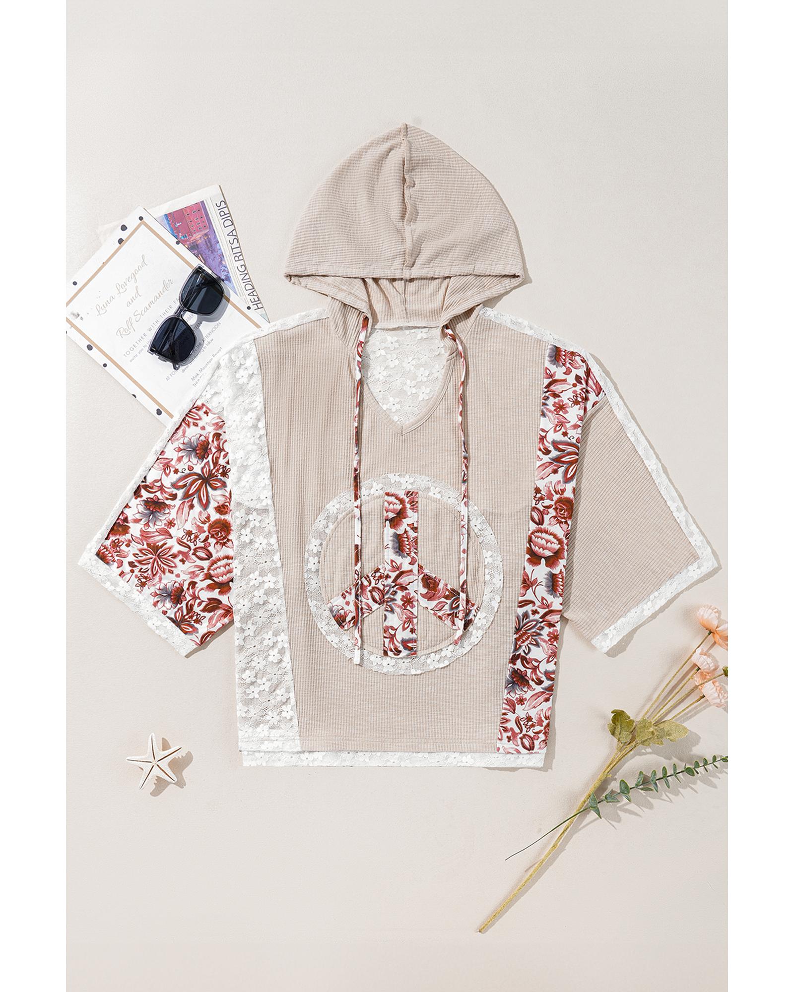 Khaki V Neck Floral Peace Sign Graphic Lace Patch Ribbed Plus Size Hooded Top – 3X