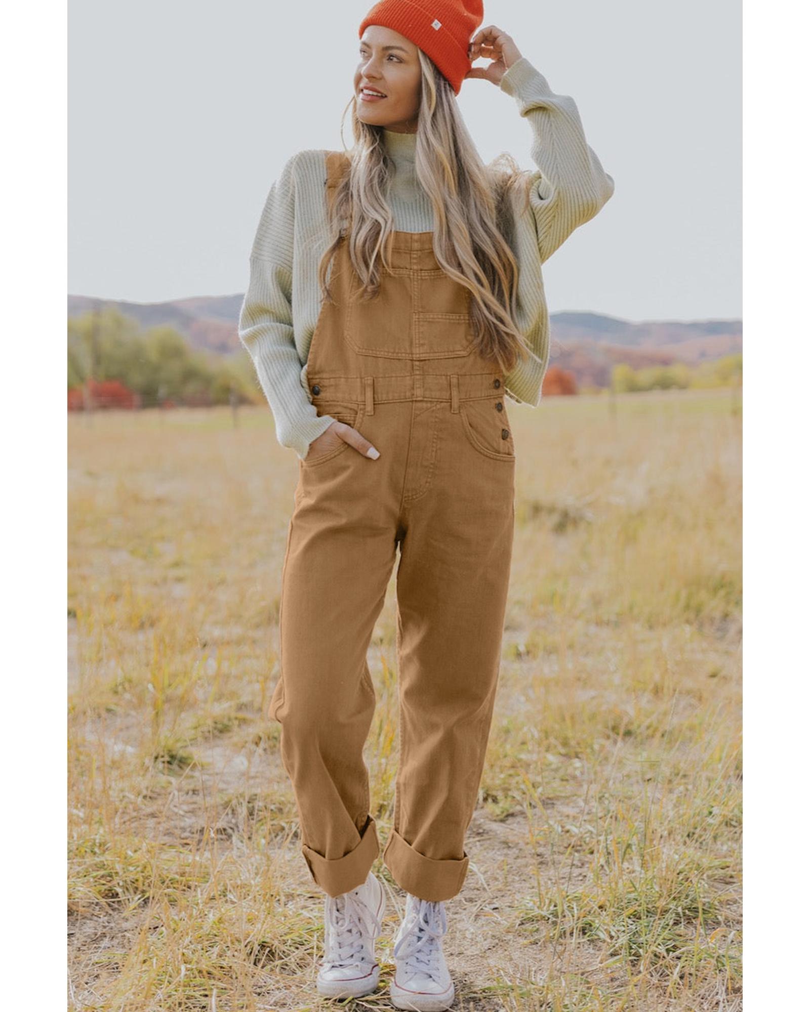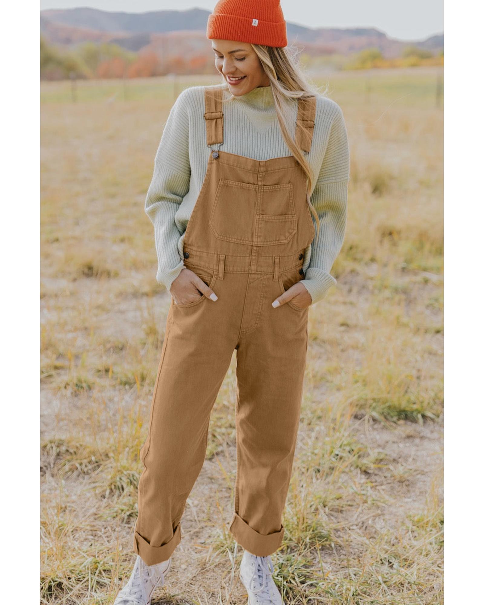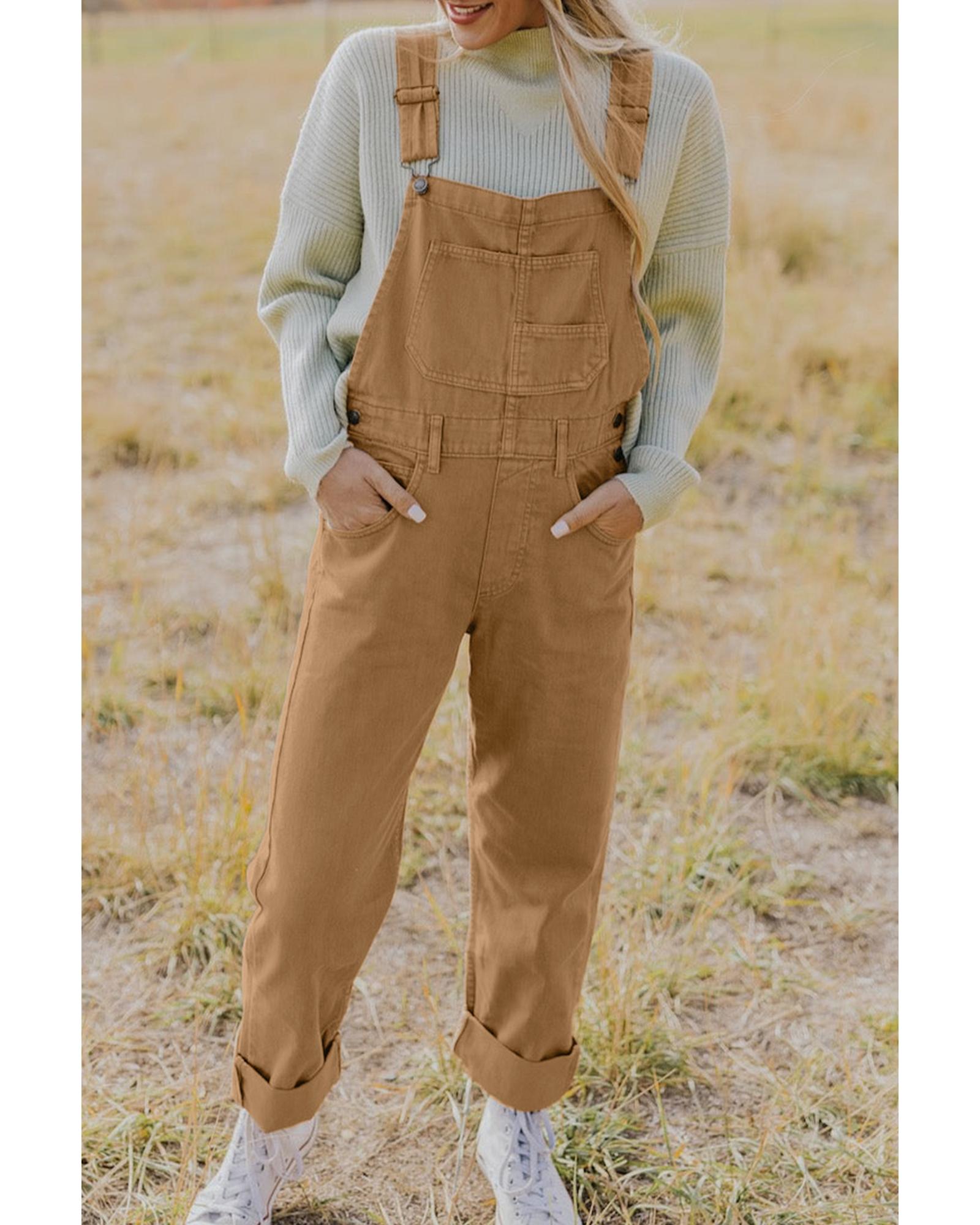 Khaki Vintage Multi Pockets Buckle Strap Cargo Denim Overalls – L