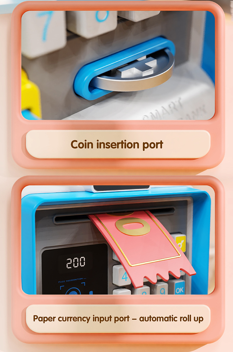 Introduce your children to the world of financial management with this cute and fun ATM Machine Piggy Bank. This thoughtful toy is designed as a “child financial manager” to help kids learn about saving money from an early age. It simulates real ATM operations, including card insertion, password entry, and even simulated facial recognition for a high-tech feel. With an automatic slot for paper money and a separate one for coins, saving becomes an exciting activity. The machine also features accompanying music and sound effects, making children fall in love with saving their money.
