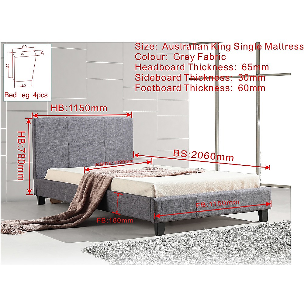 This bed from the expert craftspeople at Palermo measures 115 cm wide by 206 cm long, with a headboard that measures 88 cm tall (10cm leg 78cm headboard) from top to bottom. It fits a king single mattress measuring 106 x 203 cm. The frame and headboard feature a durable Linen Fabric covering that's easy to clean and that will look great for many years to come. The headboard is padded for comfort while sitting up and reading or watching TV. An attractive stitched-together look and clean, simple lines make this bed frame a perfect complement to the modern bedroom. And the grey colour adds visual appeal without being ostentatious.