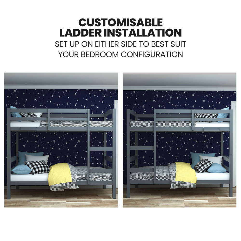 You can also take advantage of customisable ladder configuration, which allows you to install it on either the left or right side to best suit the room layout. Straightforward instructions are provided, along with quality fasteners and pre-drilled holes.The Kingston Slumber Modular Bunk bed is a practical and stylish addition to any room.