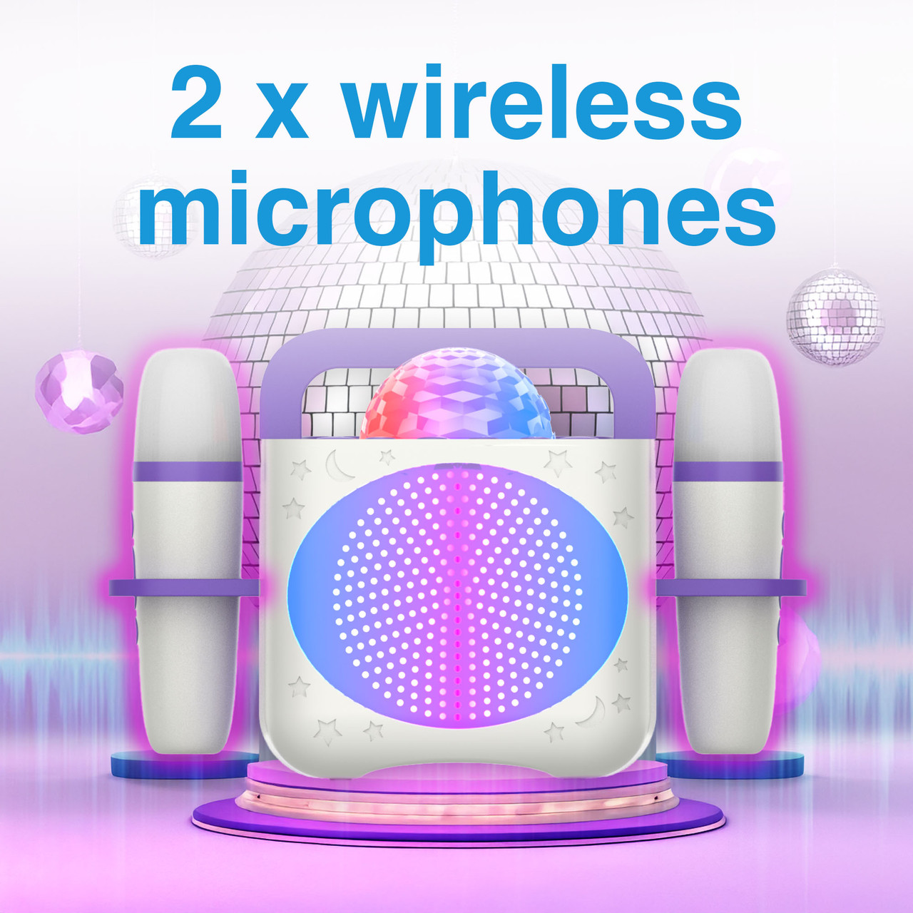 Two Wireless Microphones Whether performing solo or duets, kids can sing, dance, and interact with their audienceno cords, no limits.