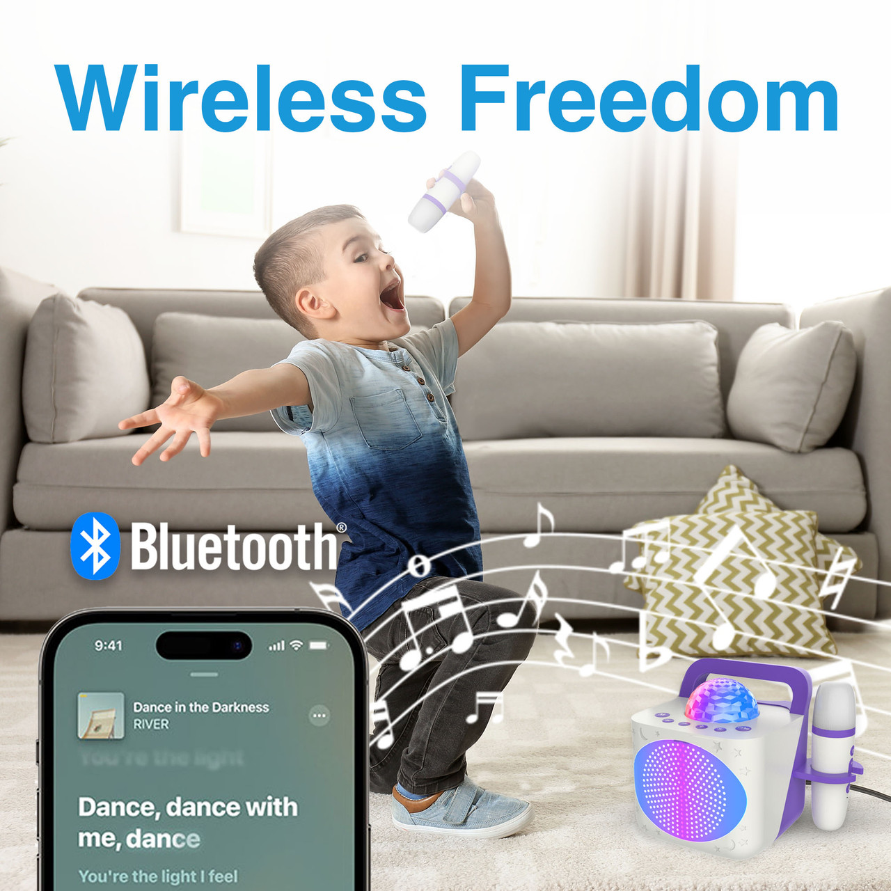 Wireless Karaoke Fun: Two wireless microphones let kids sing solo or duet without tangled cords