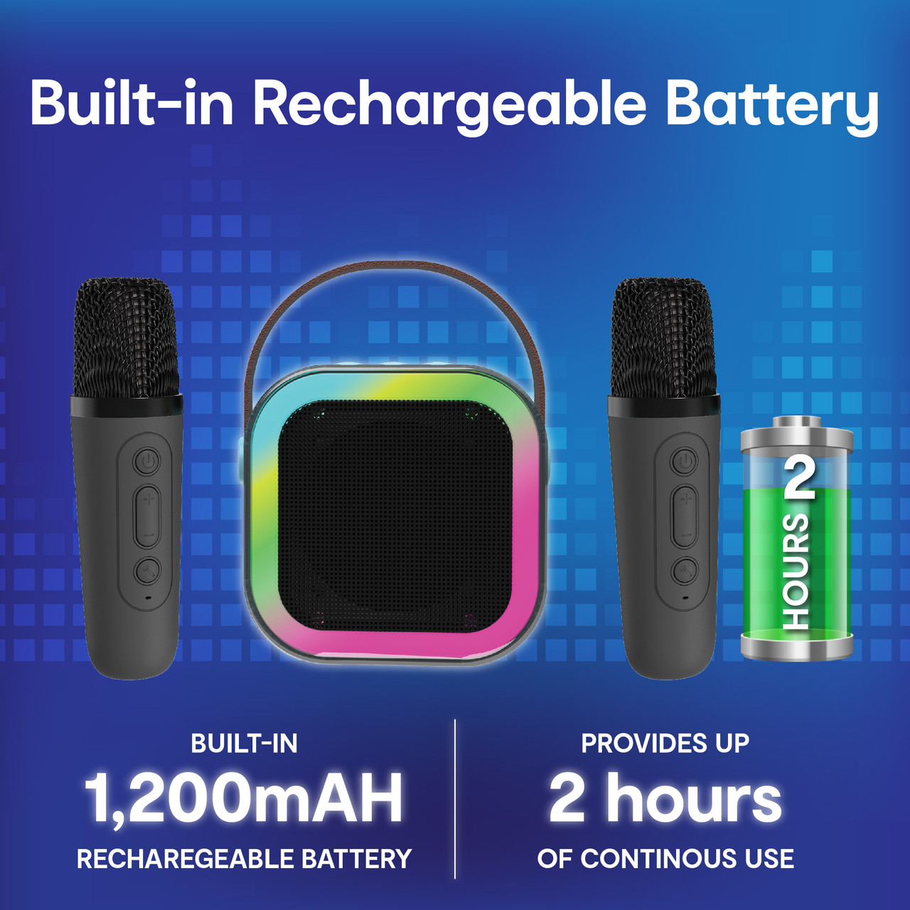 • With up to 2 hours of battery life on full charge, this karaoke speaker offers the flexibility to take the fun wherever you go. Turn your car into a karaoke room or let the kids sing their hearts out anywhere in the house.