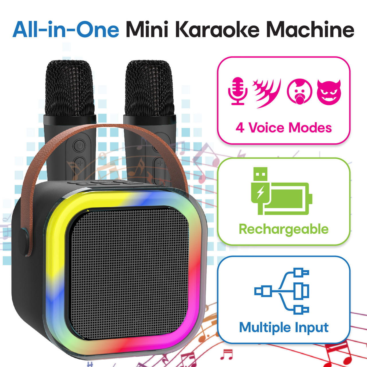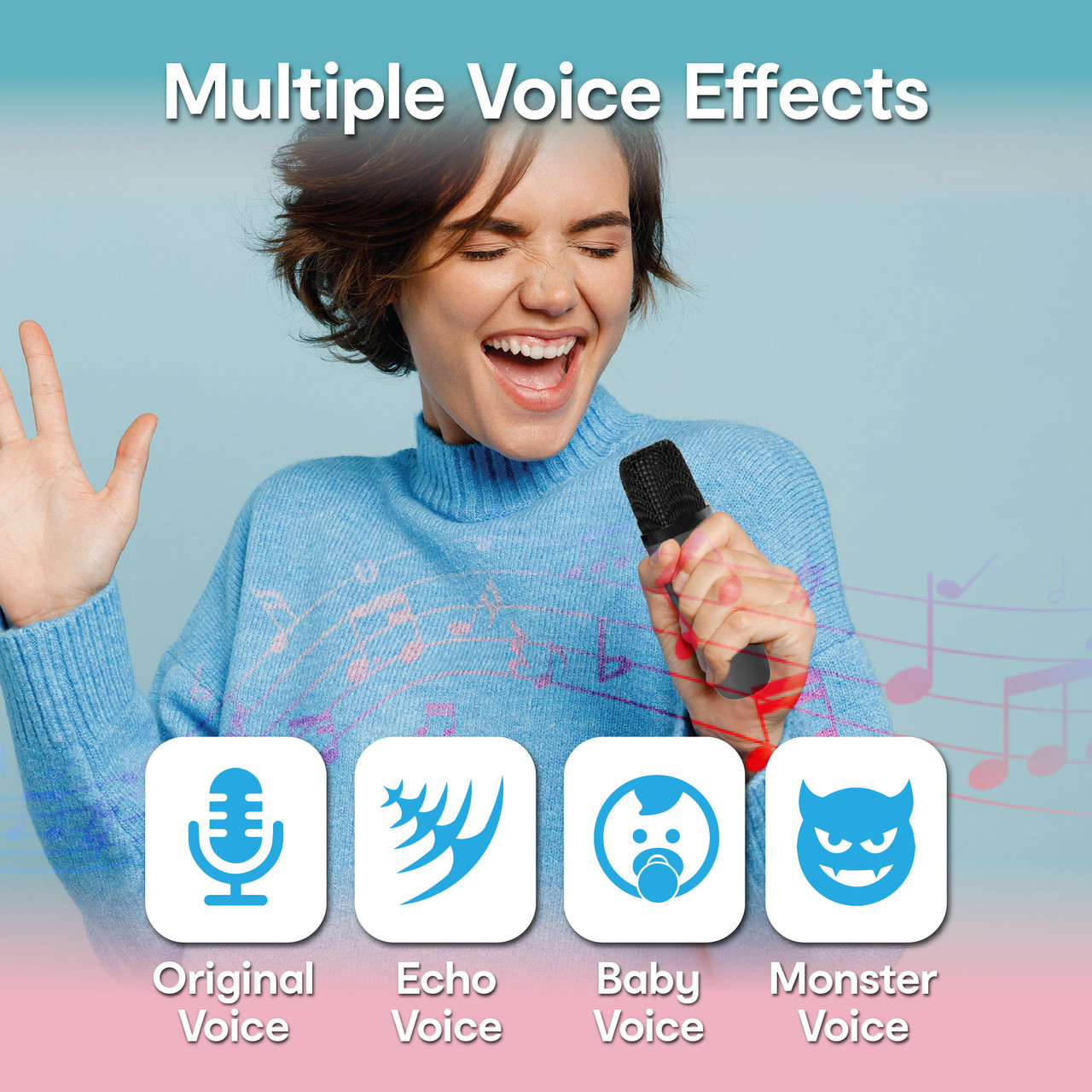 • Featuring two microphones and four fun voice effects: Original, Echo, Monster, and Baby Voicethis Bluetooth karaoke machine is perfect for duets and lively dance-offs.