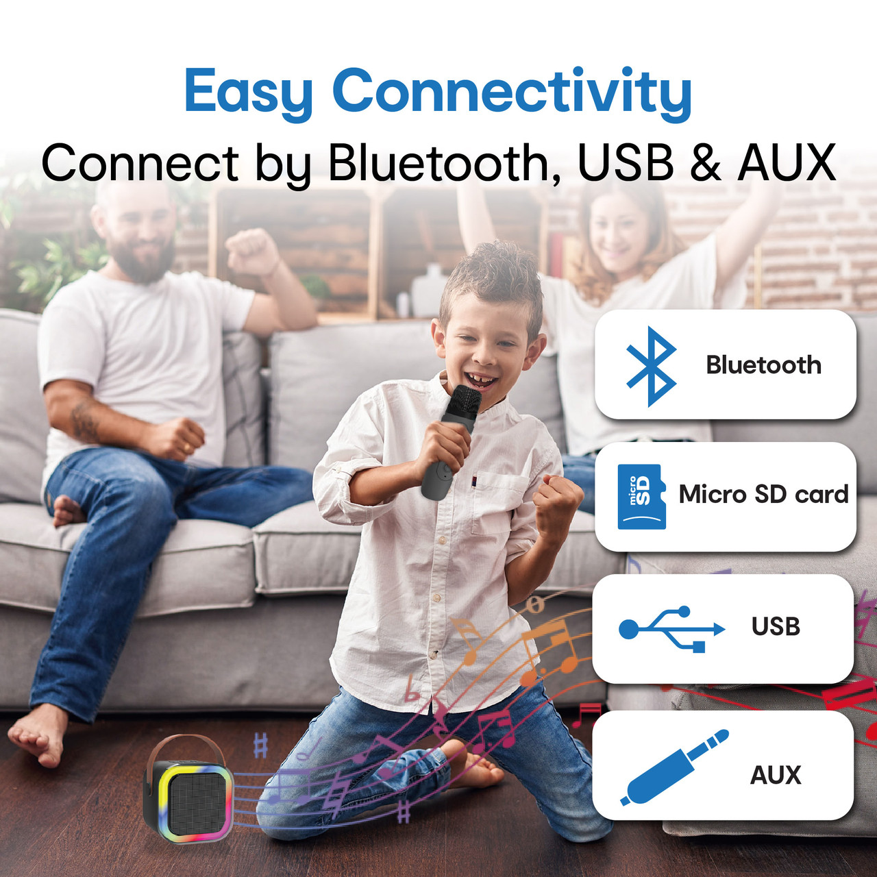 • Connectivity: The Mini Karaoke Machine is easy to setup, connecting to smartphone via Bluetooth. Other inputs include music files on Micro SD cards, USB flash drives or 3.5mm AUX-in connectivity.