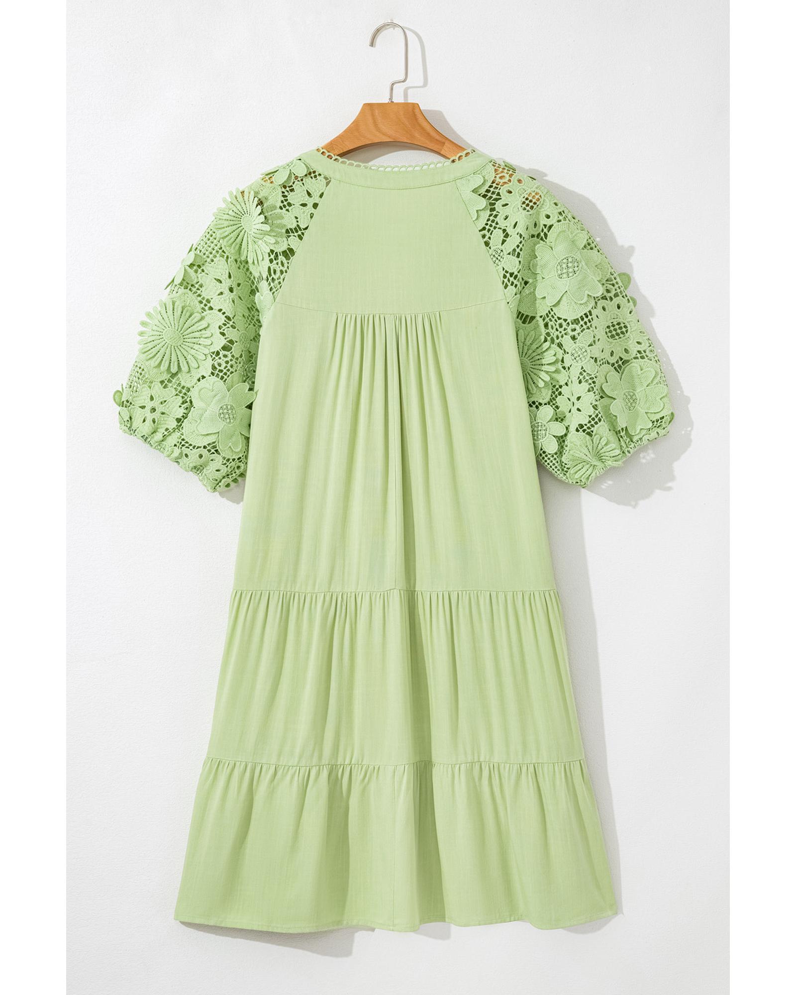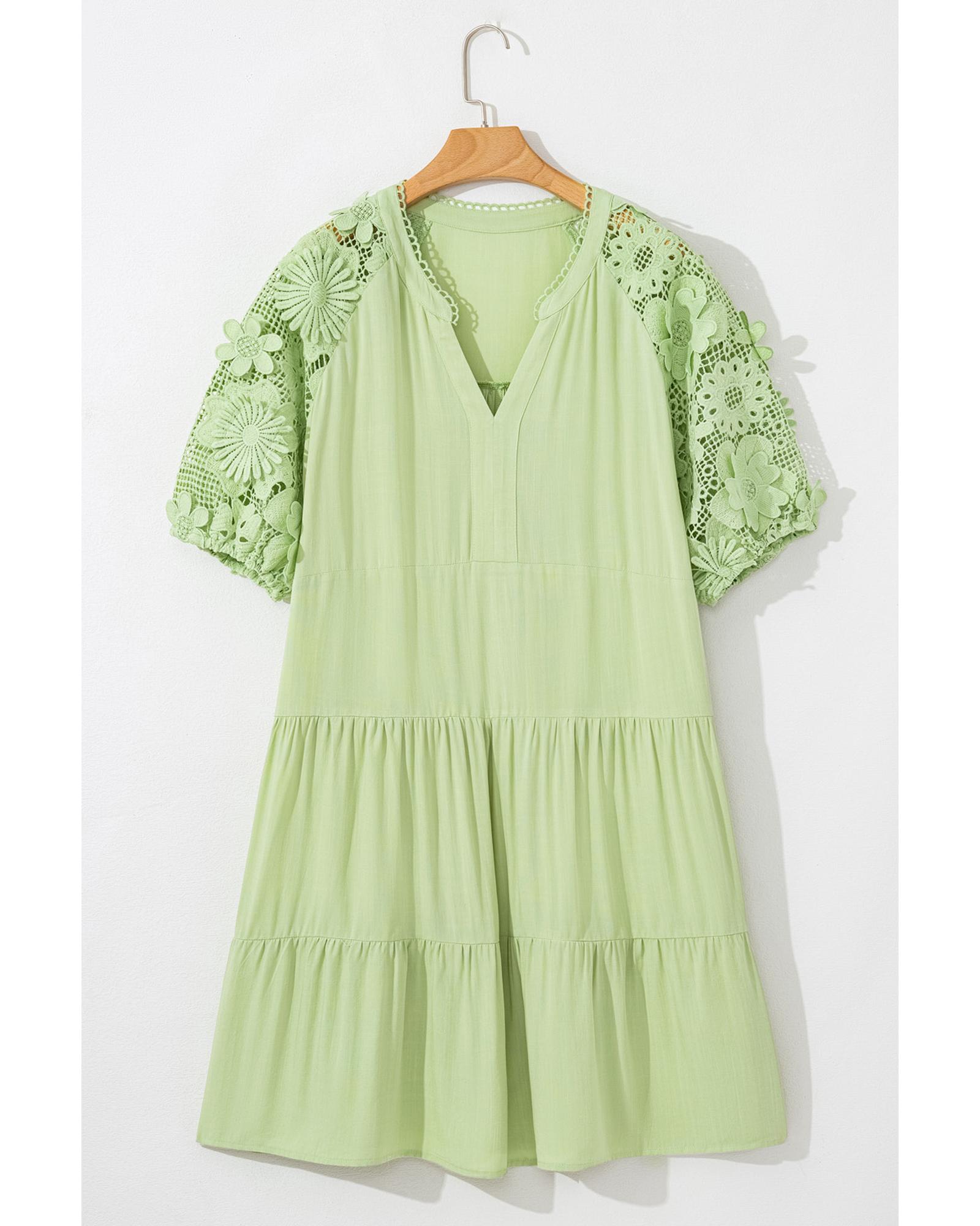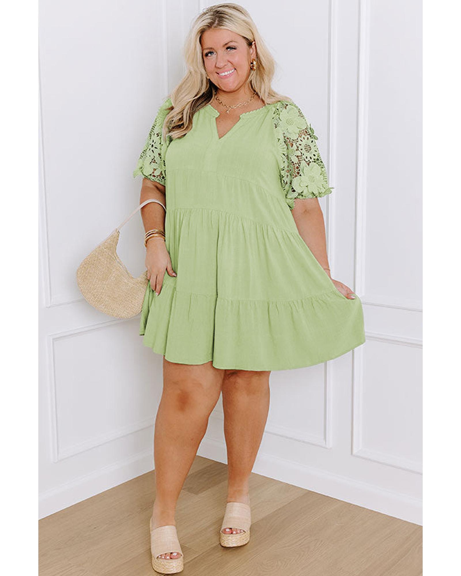 - Laurel Green Floral Crochet Short Sleeve Notch V Neck Tiered Plus Size Mini Dress