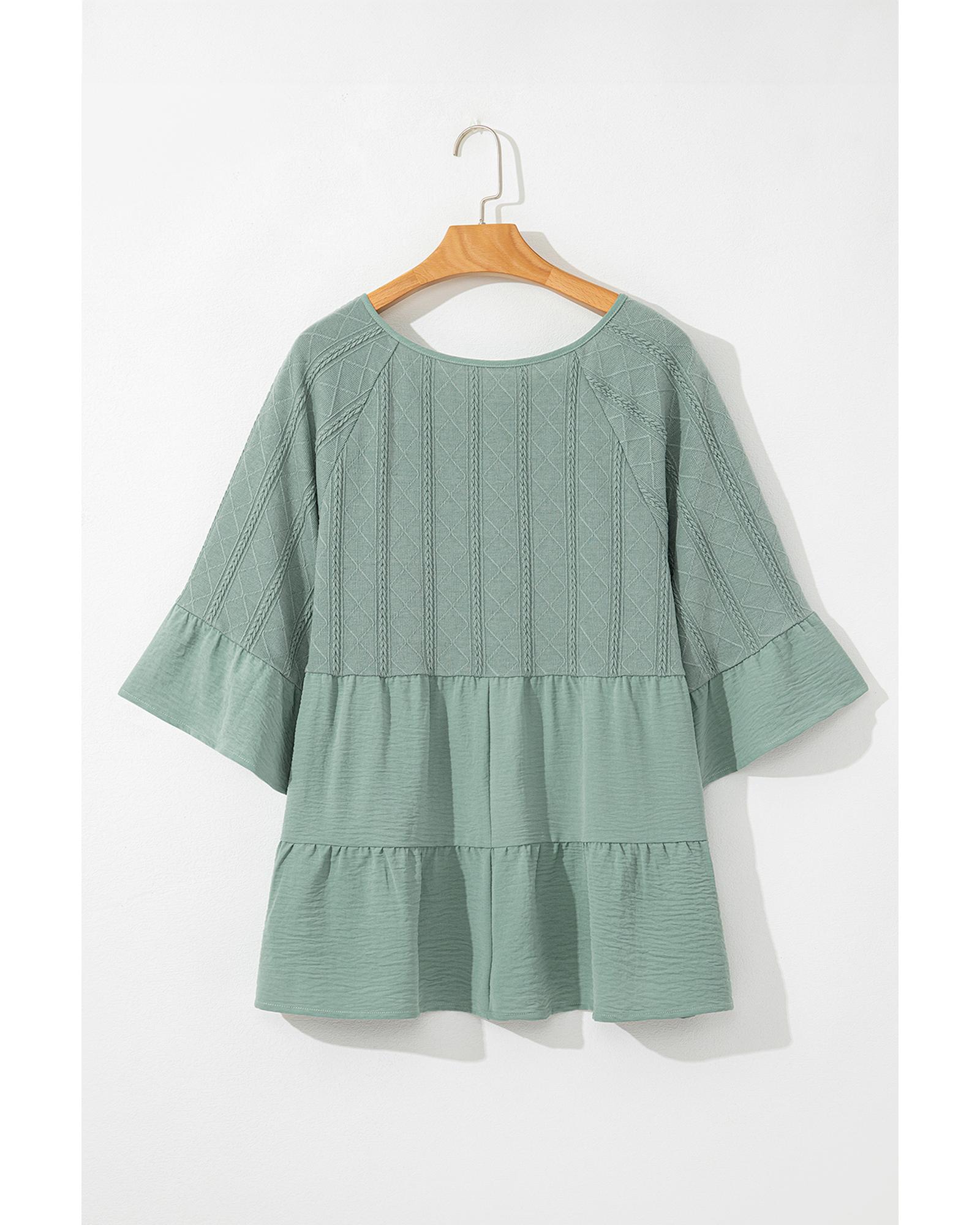 Laurel Green Tie Split Neck Textured Ruffle Patchwork Blouse – M