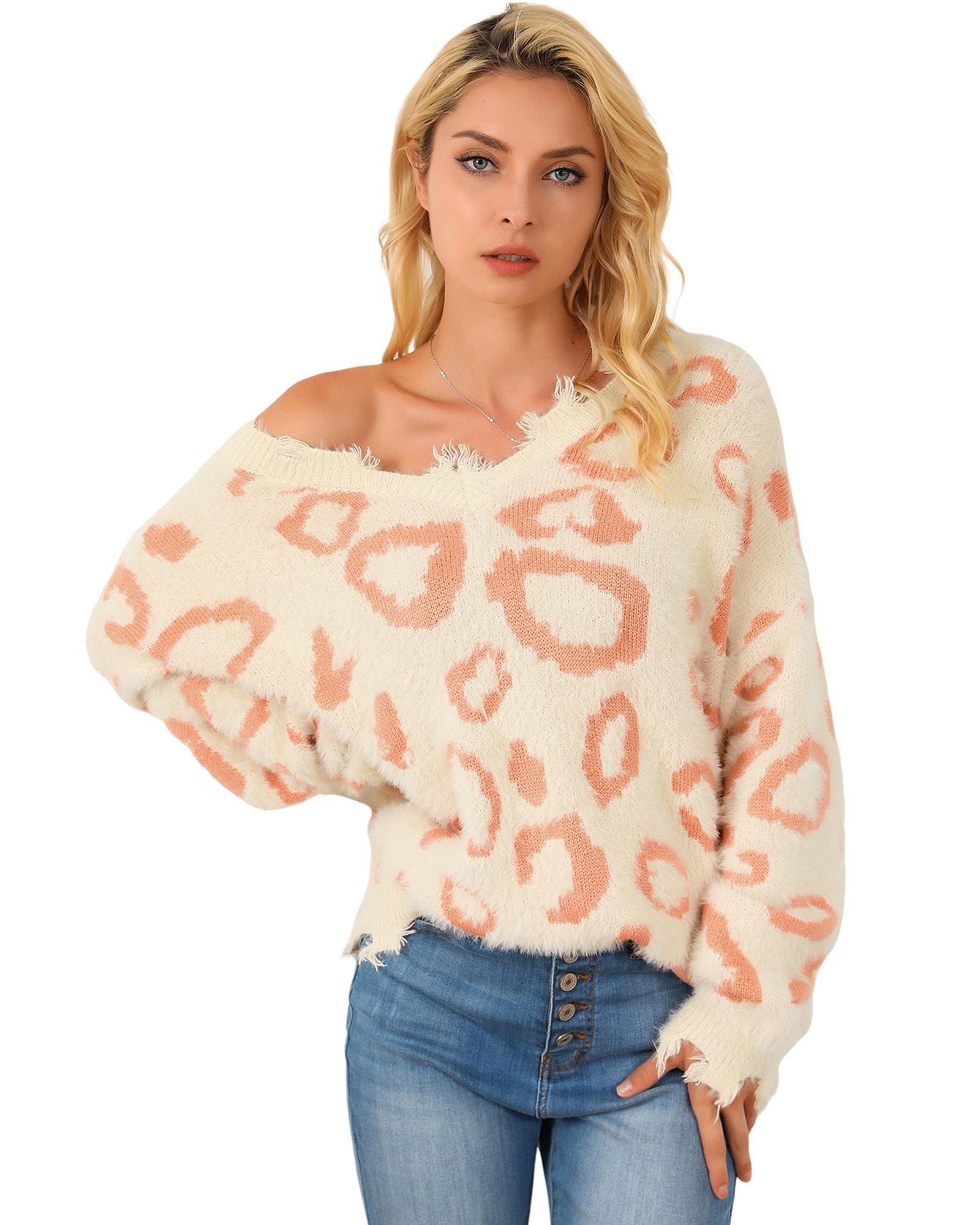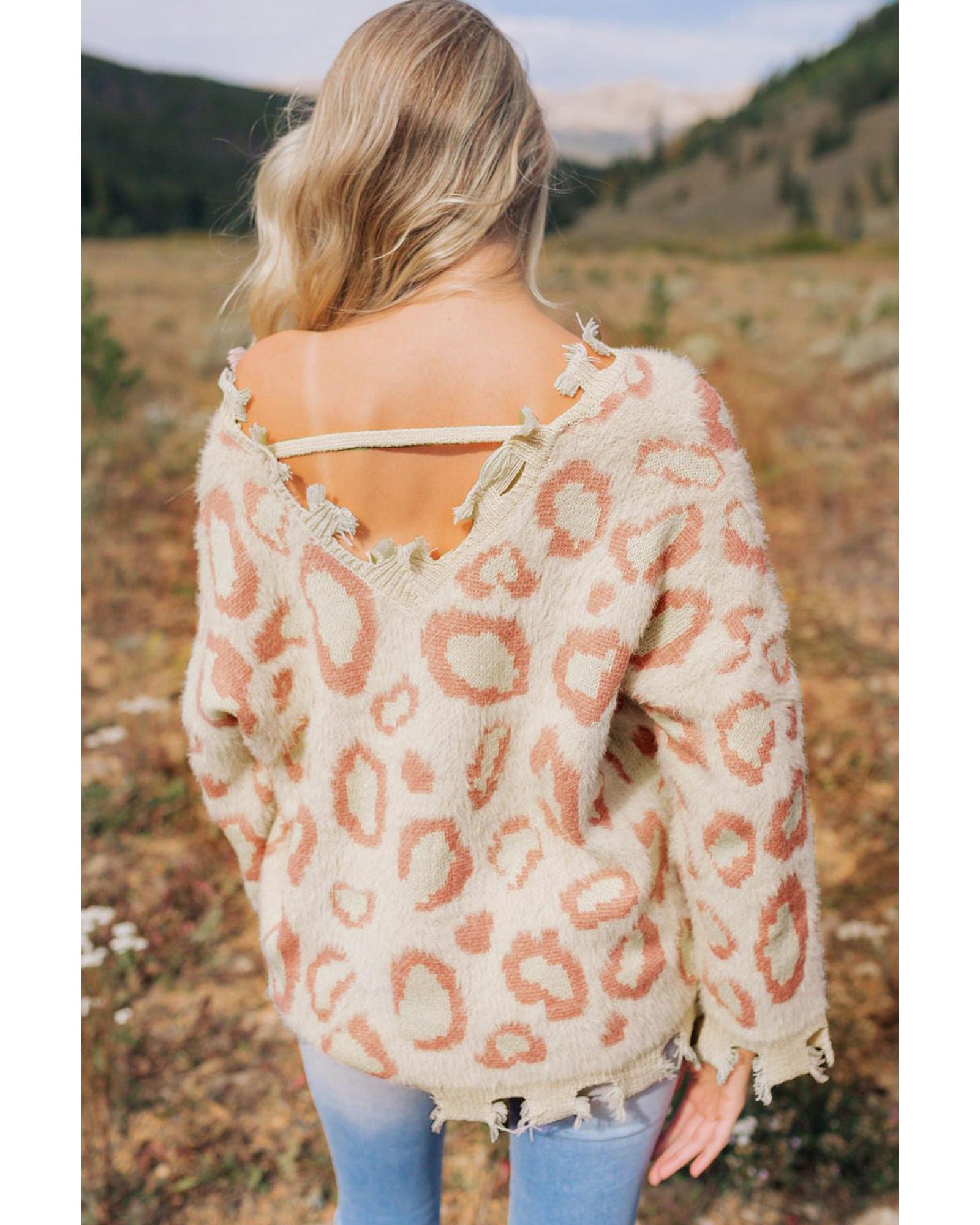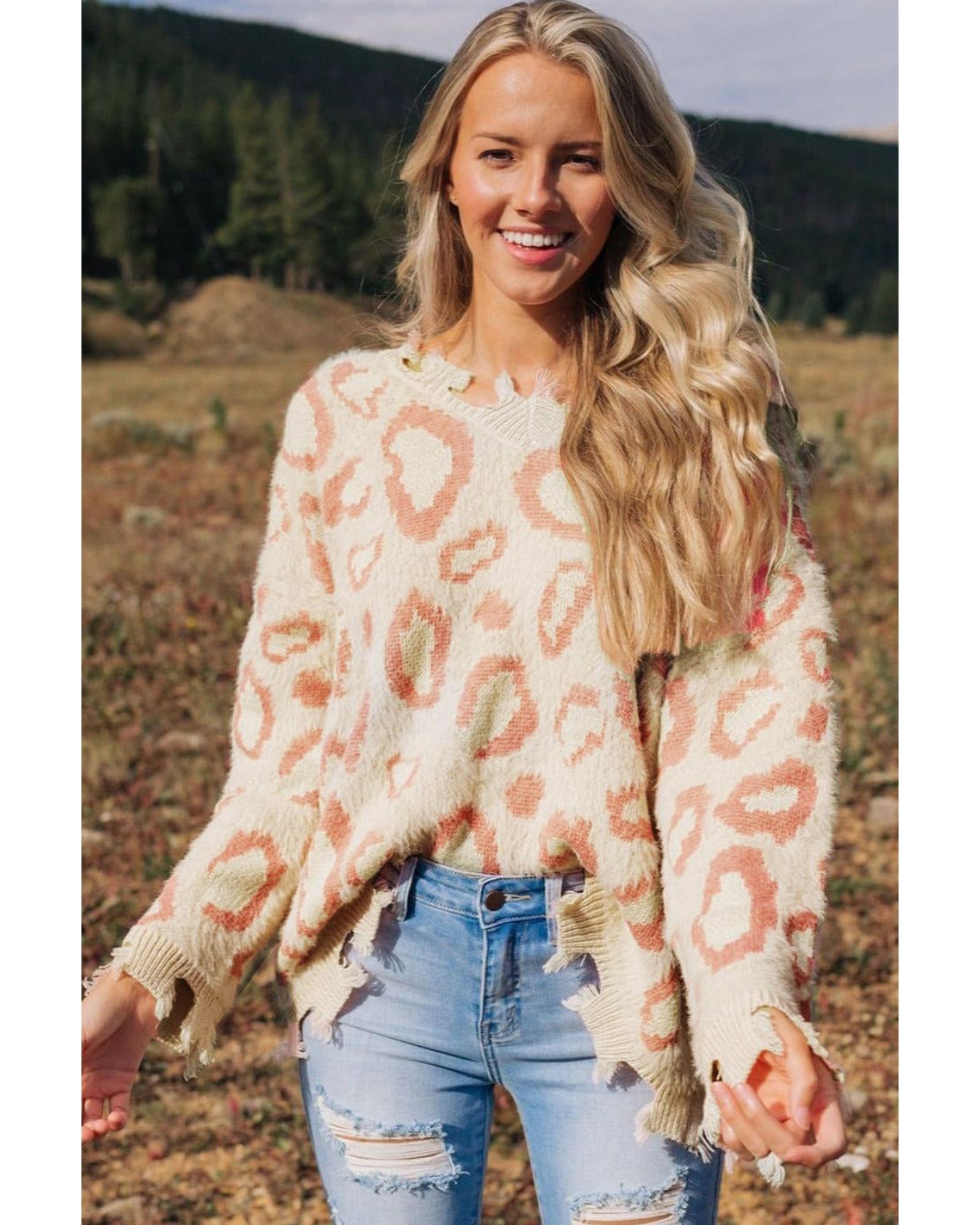 • Leopard Animal Print Distressed Trim Fuzzy Sweater