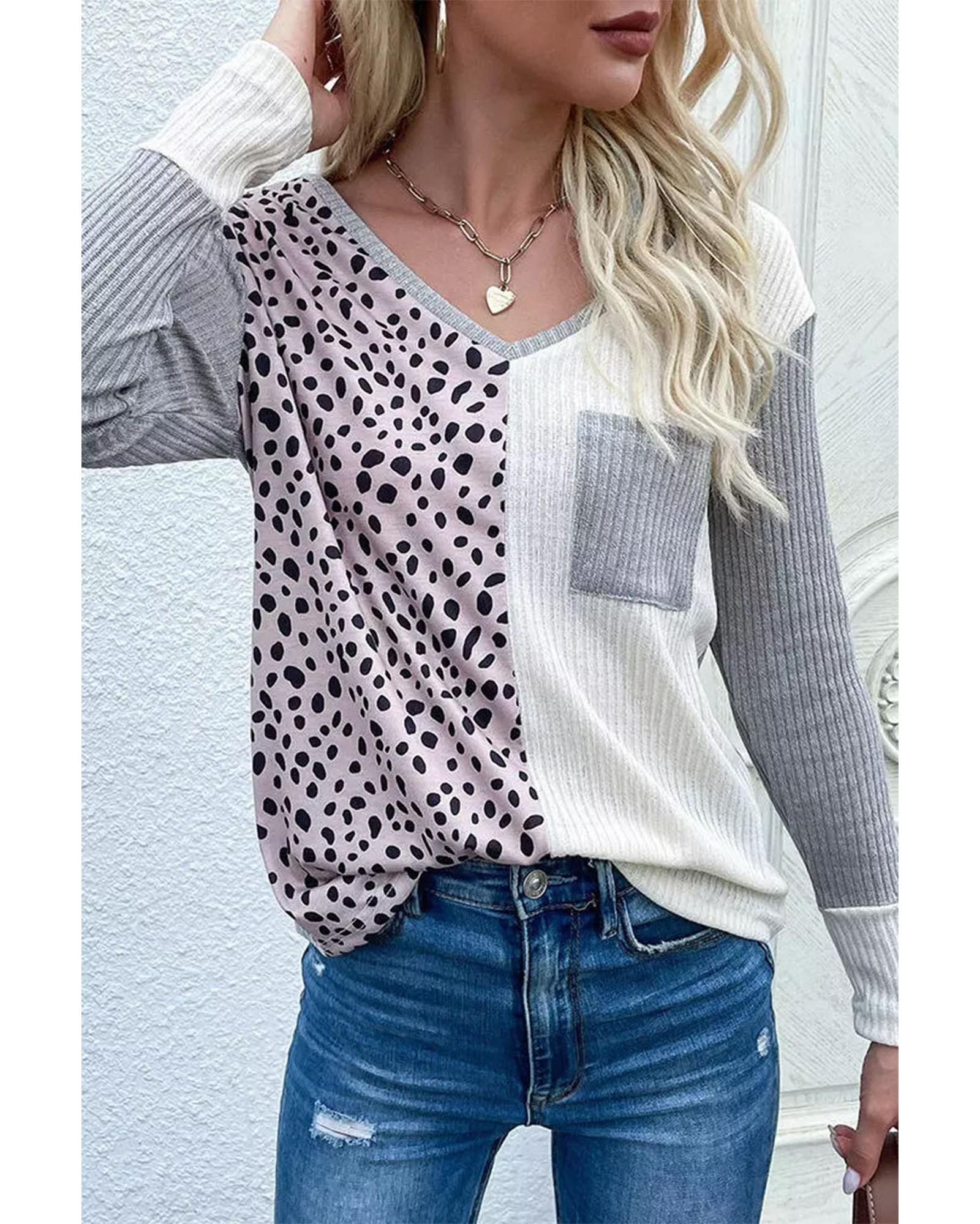 Leopard Patchwork Ribbed Color Block V Neck Top – M