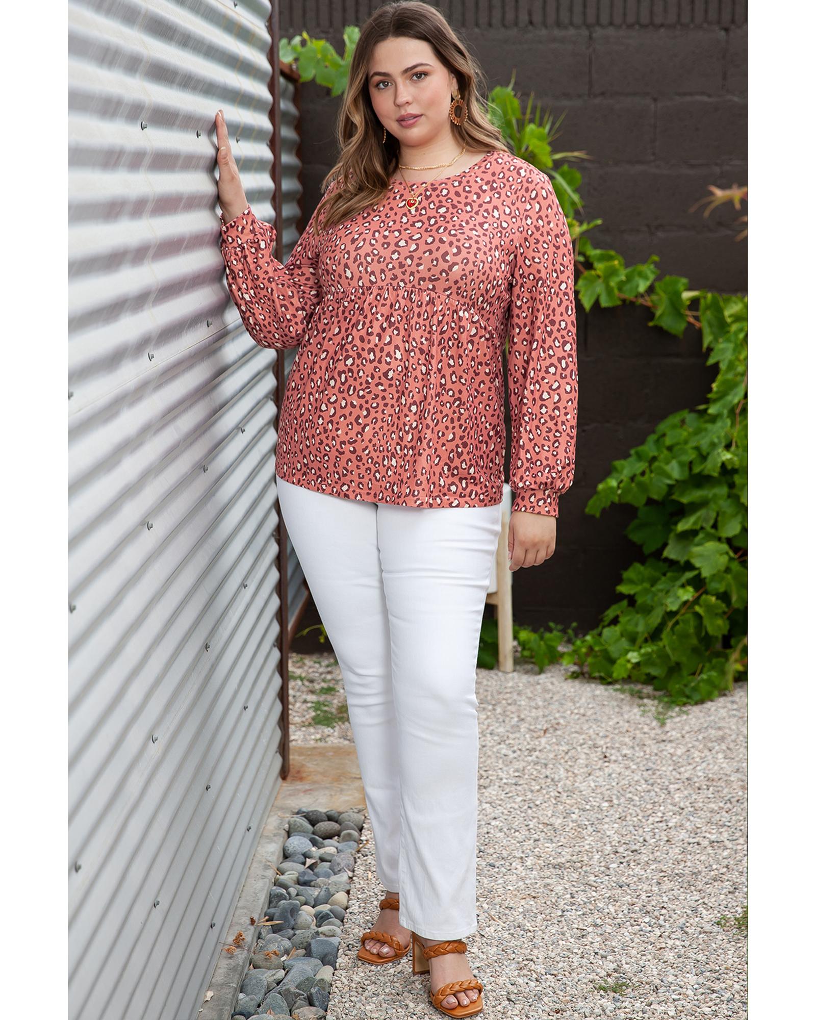 Leopard Print Long Sleeve Ruffled Babydoll Plus Size Blouse – 1X