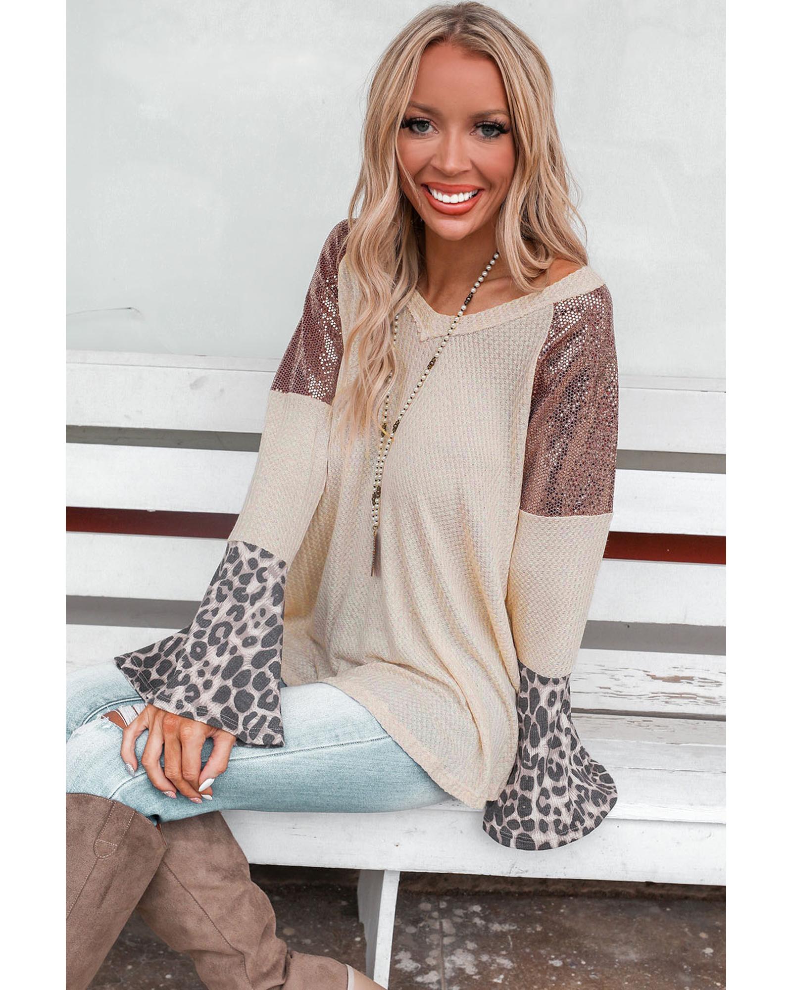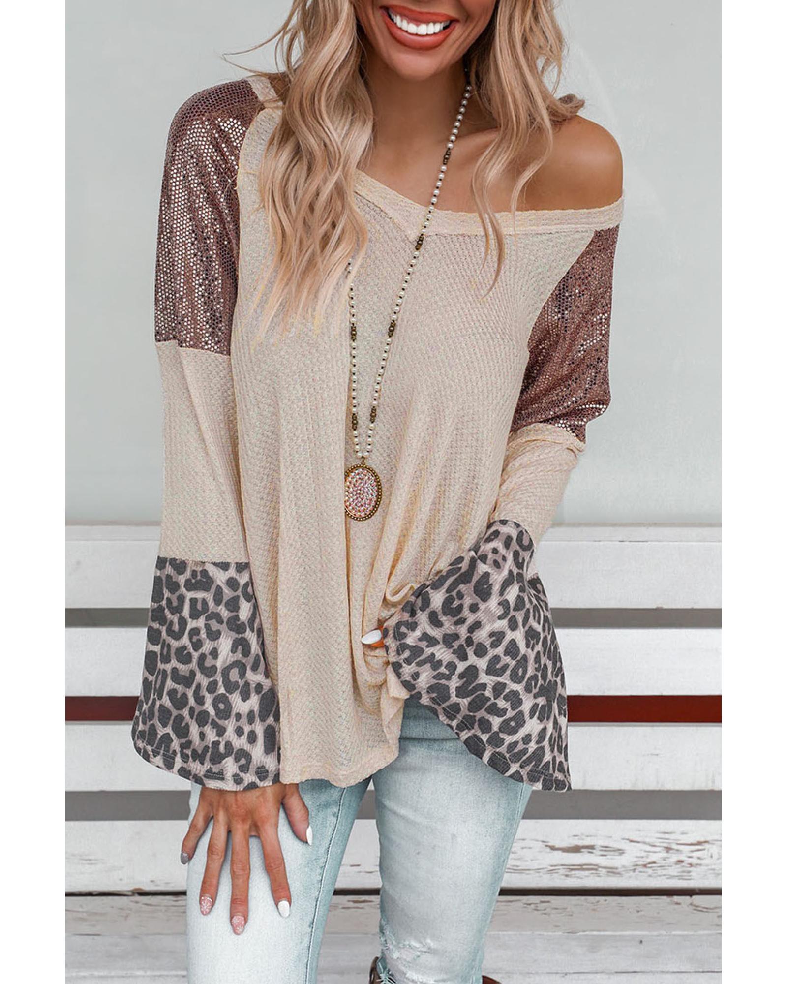 - Leopard Sequin Patchwork Bell Sleeve V Neck Tunic Top
