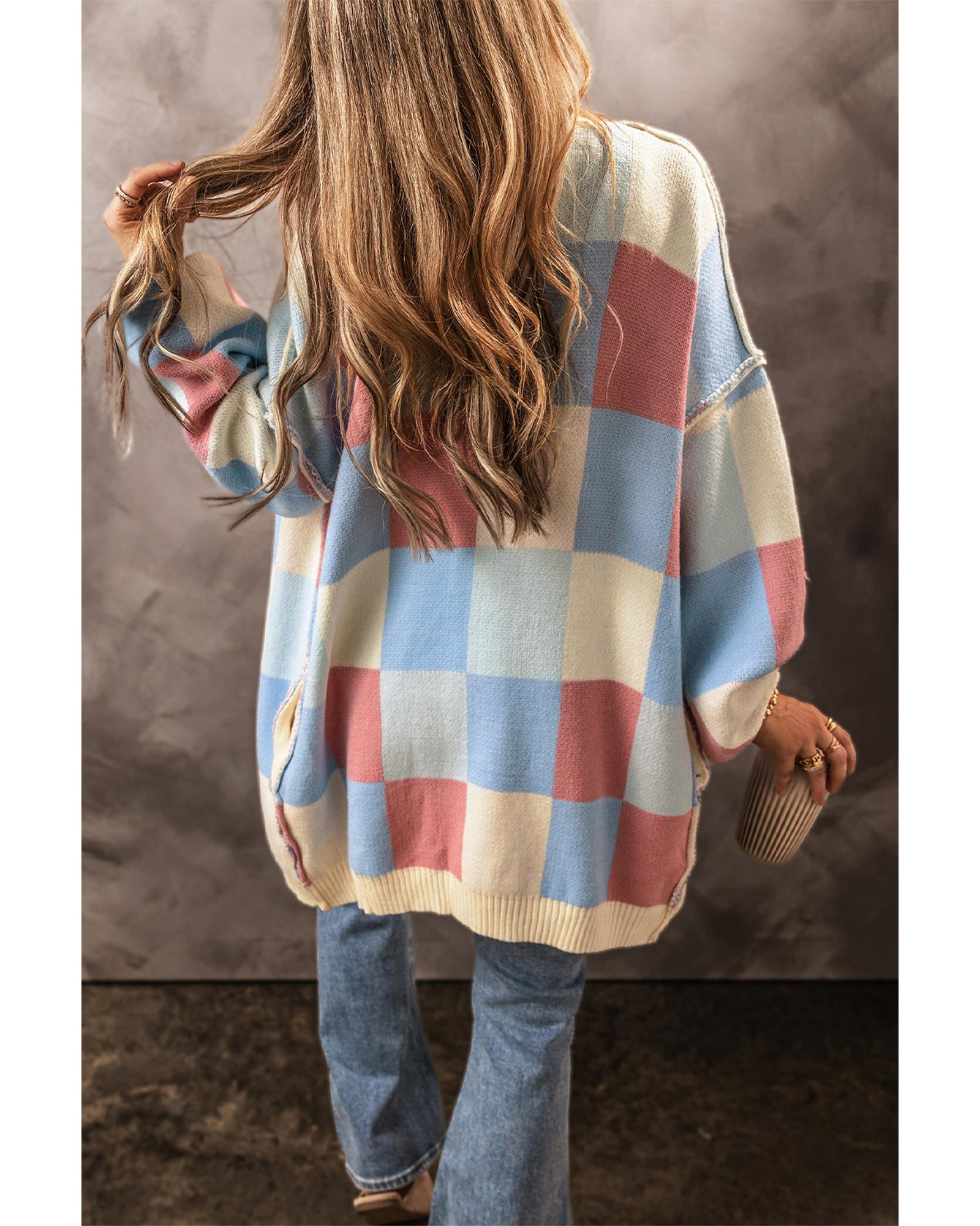 Light Blue Checkered Drop Shoulder Exposed Seam Open Front Cardigan – M