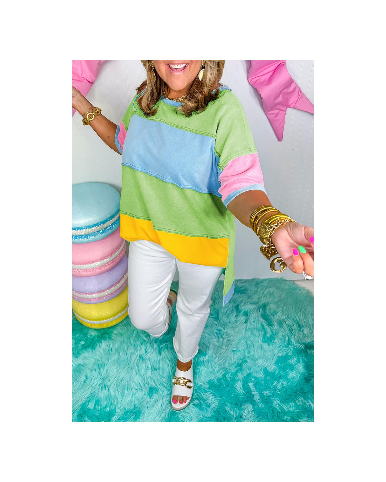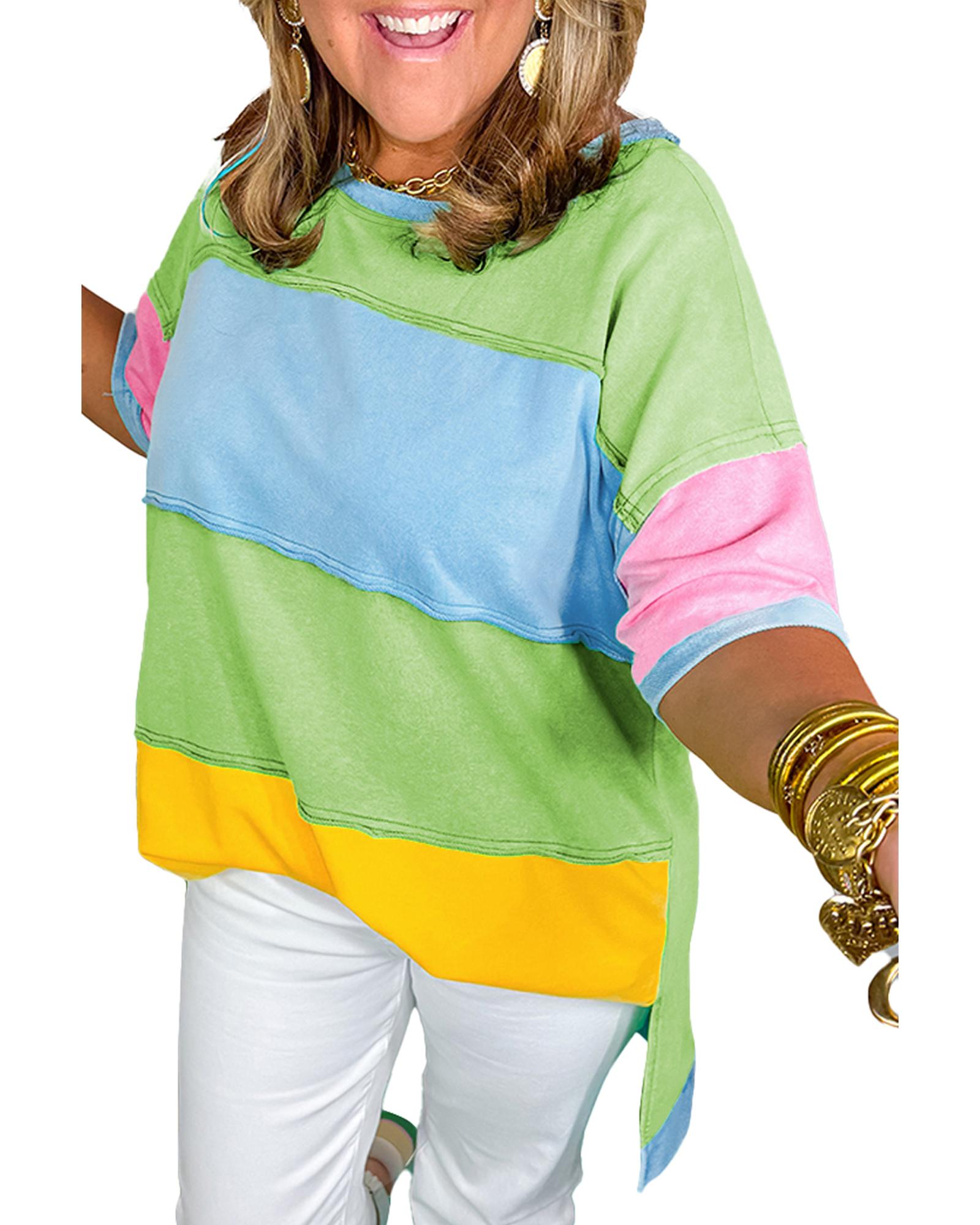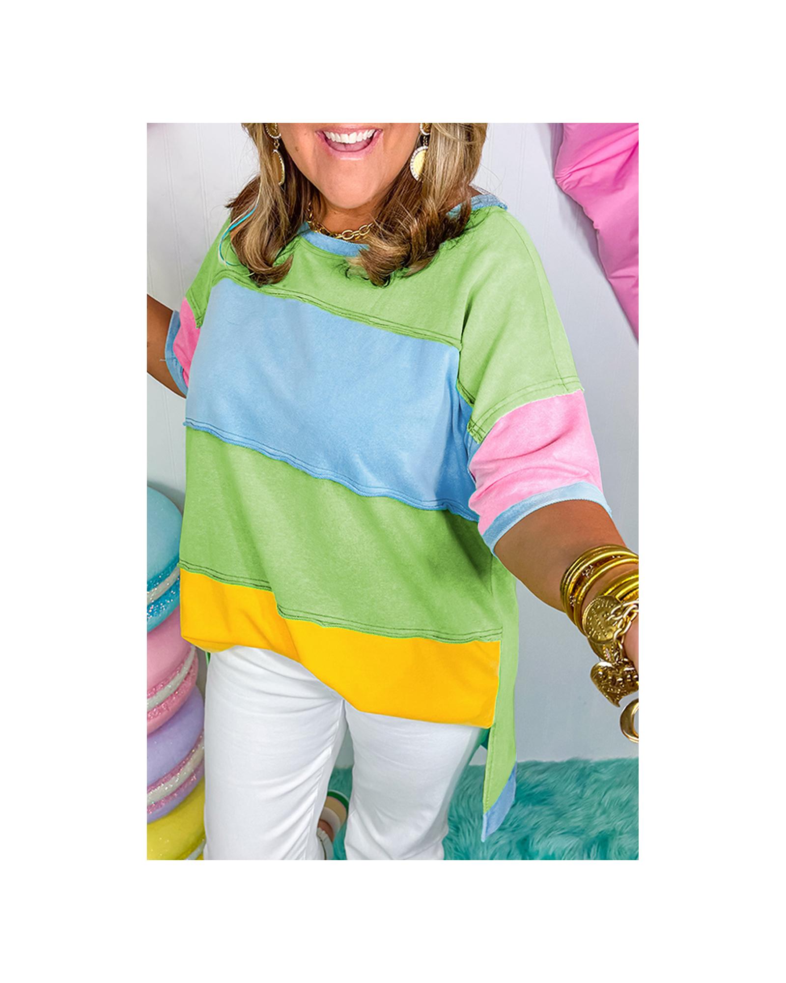 Light Blue Color Block Exposed Seam Patchwork Plus Size T Shirt – 4X