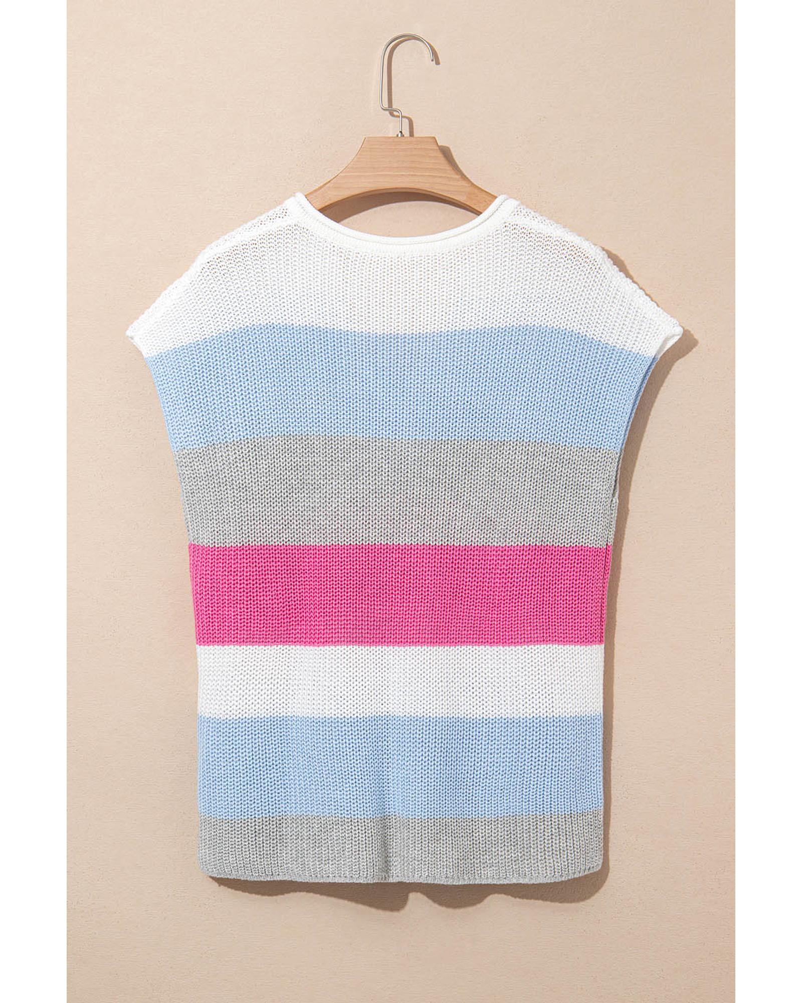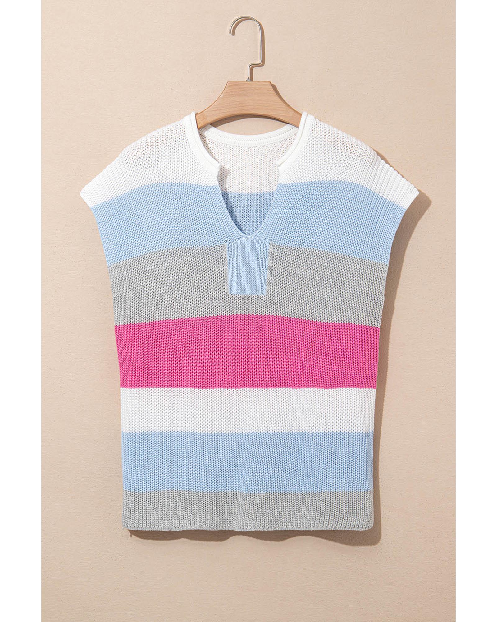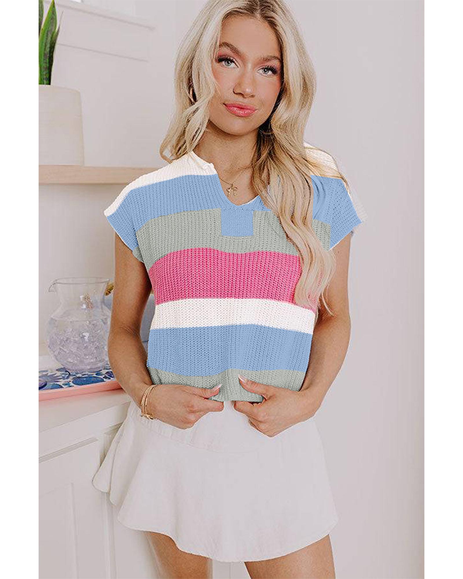 Light Blue Color Block Notch V Neck Sweater T Shirt – S