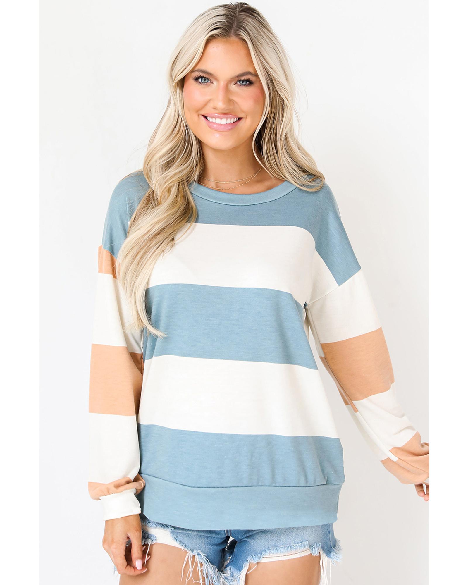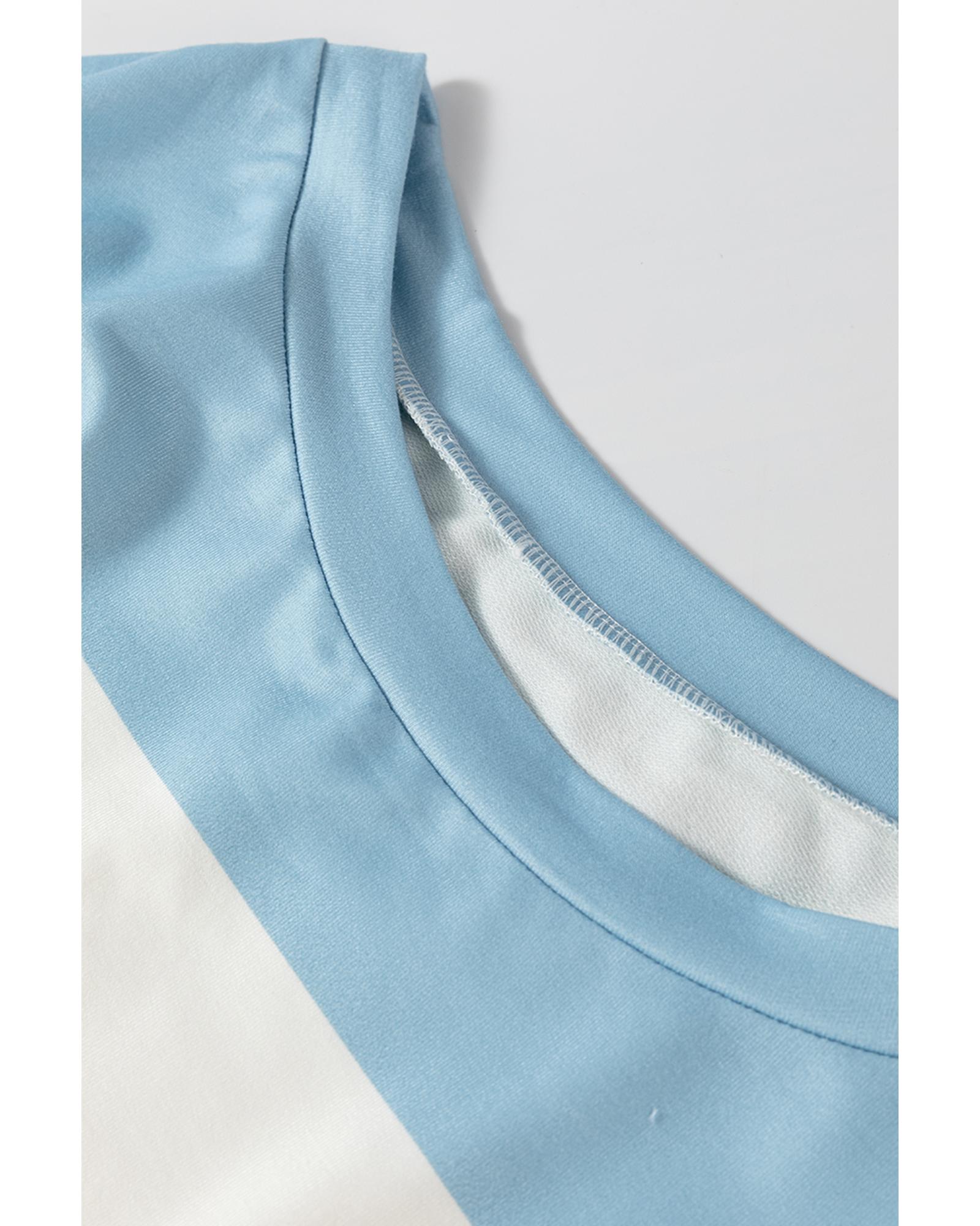Light Blue Colorblock Striped Drop Shoulder Long Sleeve Top – M