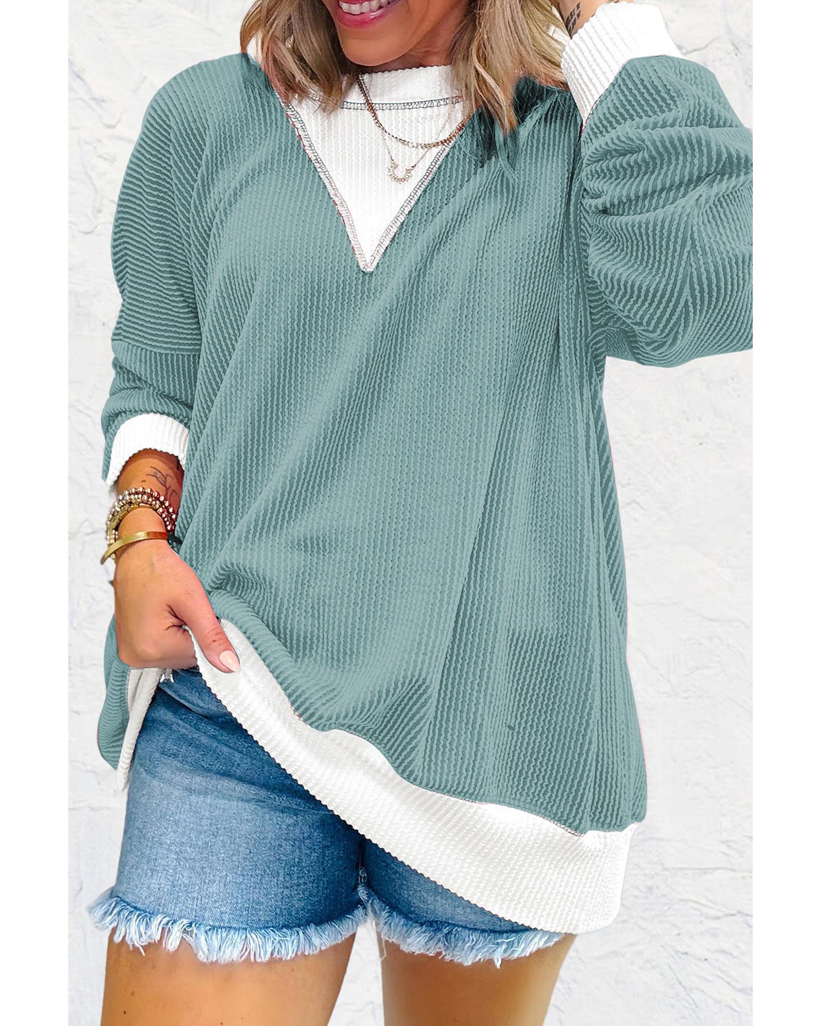 Light Blue Corded Colorblock Drop Shoulder Loose Top – M