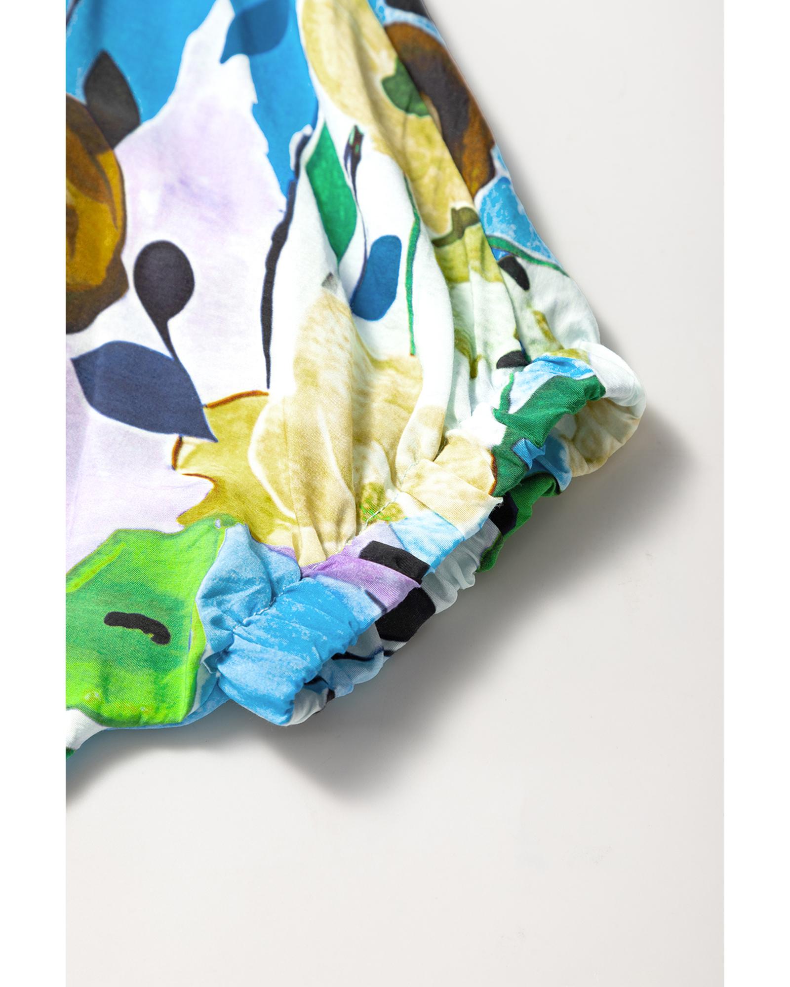 Light Blue Floral Print Slit V Neck Short Sleeve Blouse – S