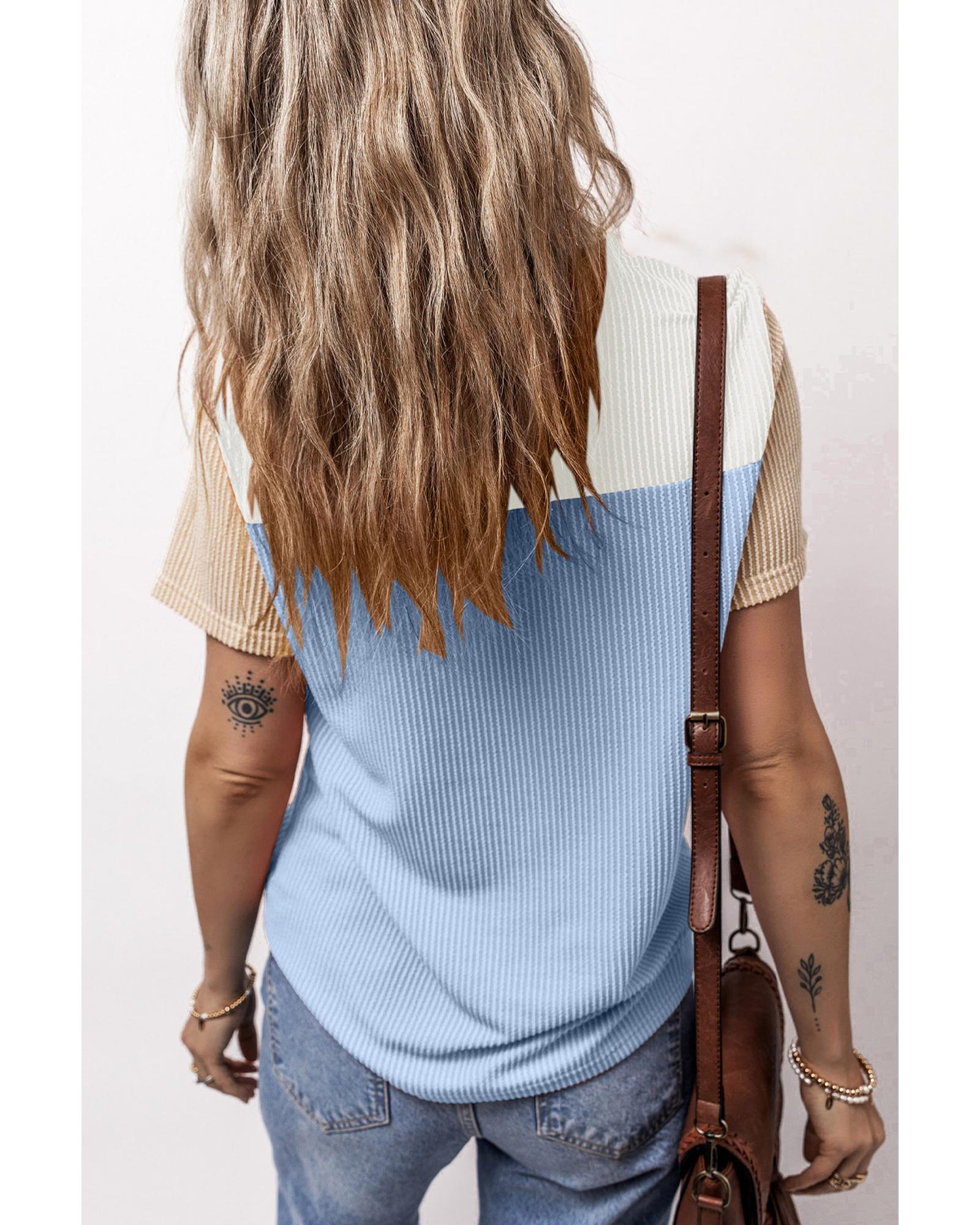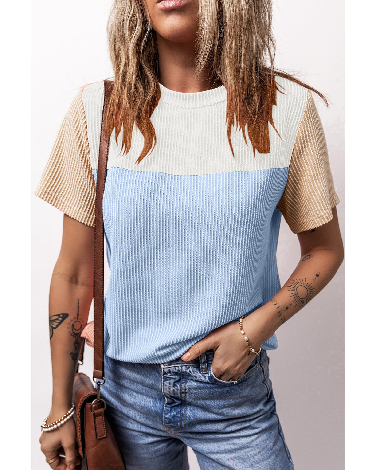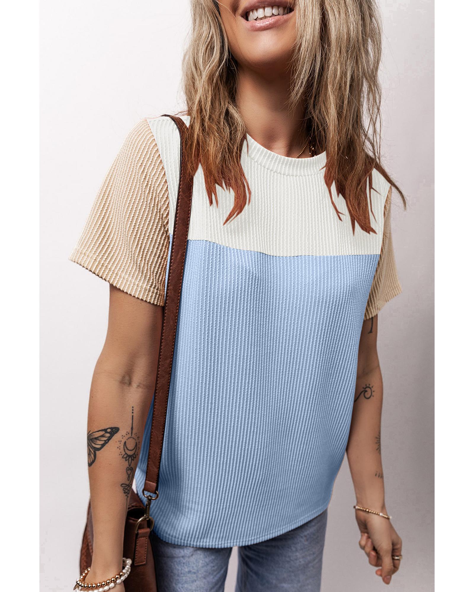 Light Blue Rib Textured Colorblock T Shirt – M