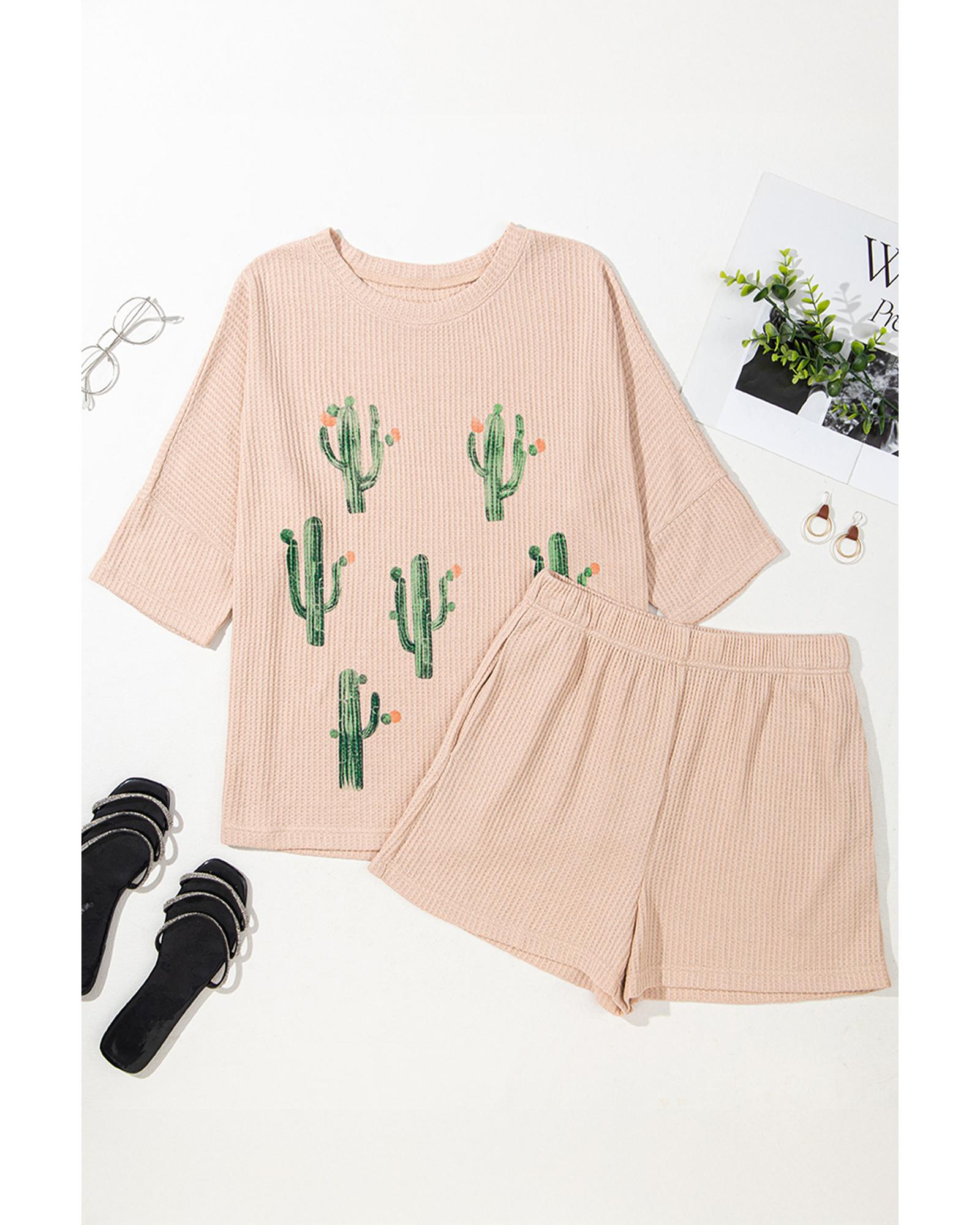 - Light French Beige Cactus Forest Waffle Half Sleeve Tee Short Set