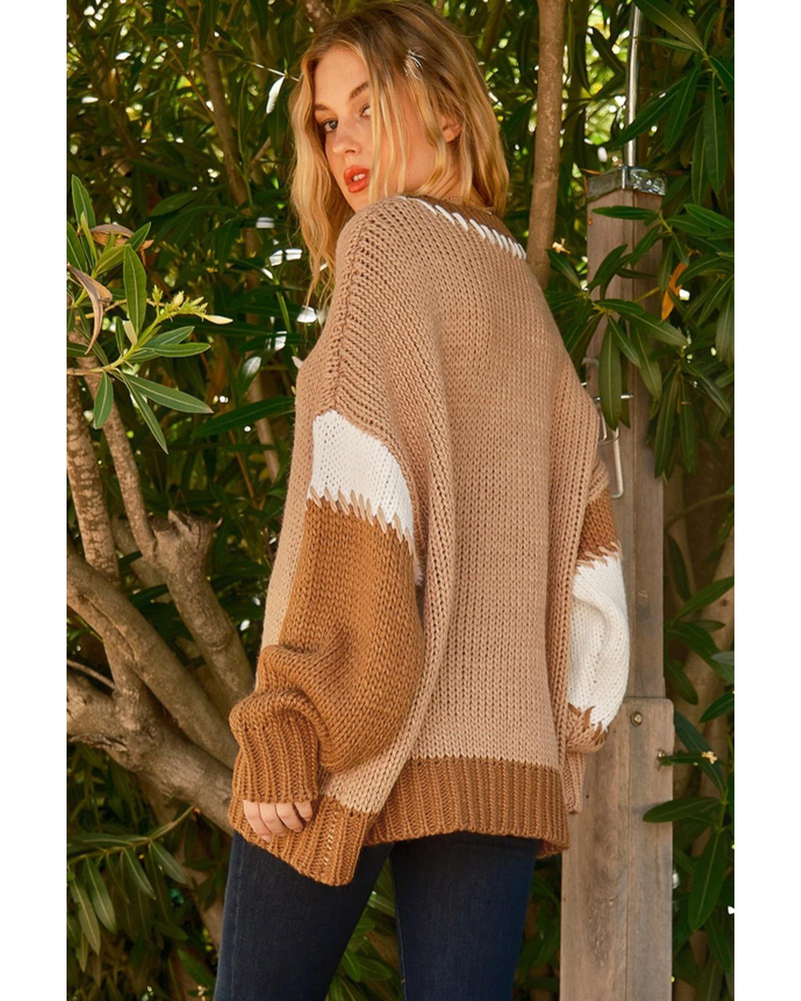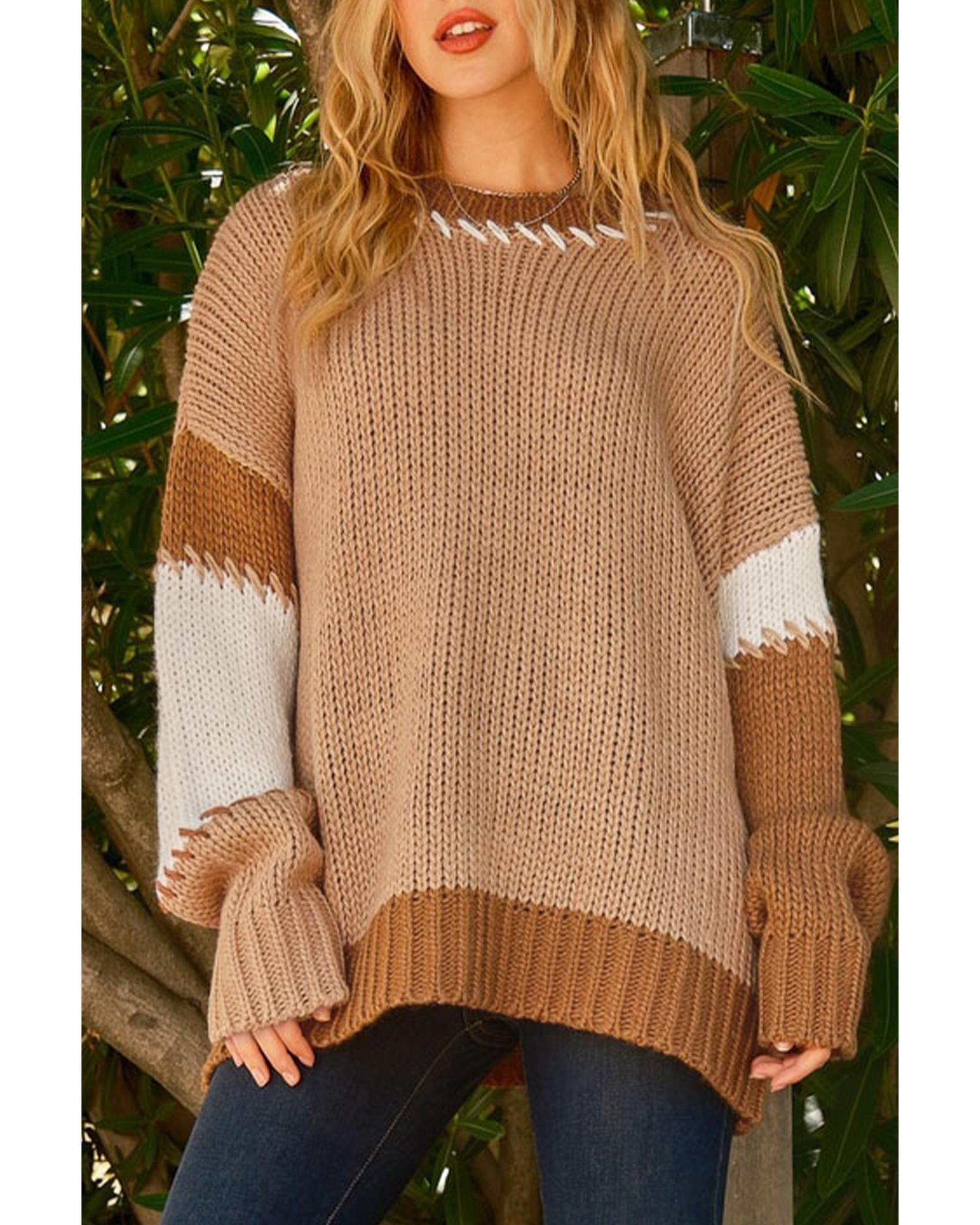 Light French Beige Color Block Contrast Stitch Oversized Sweater – M