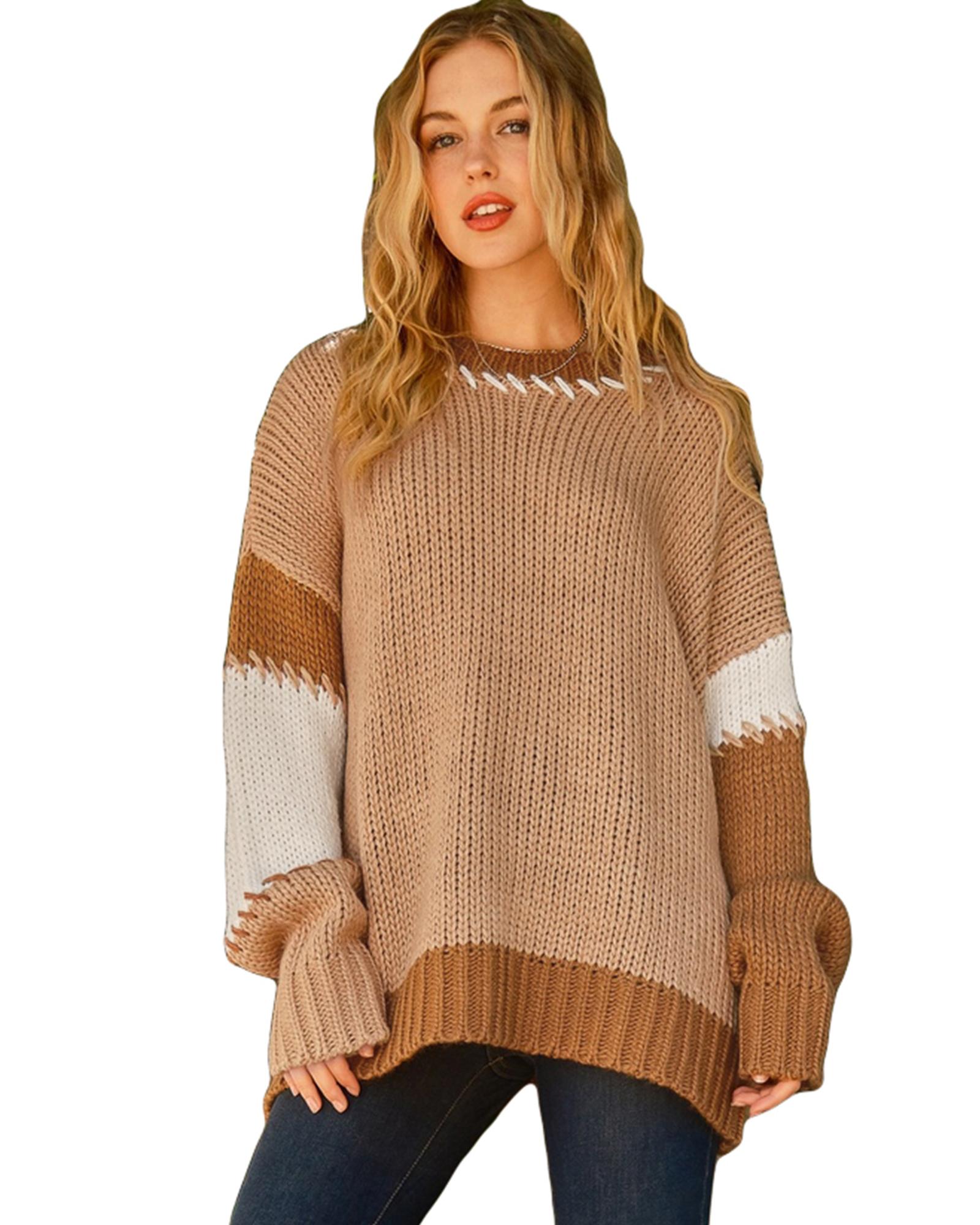 Light French Beige Color Block Contrast Stitch Oversized Sweater – S