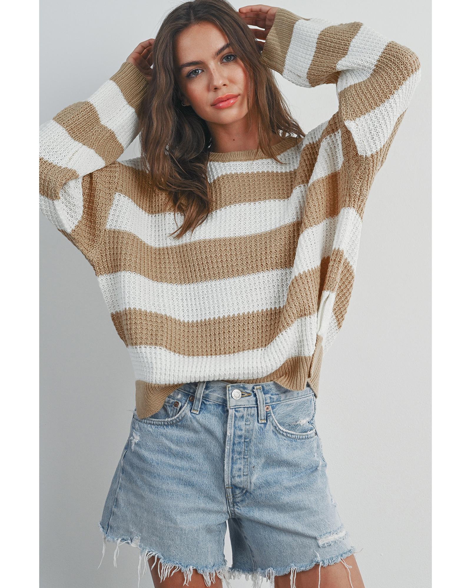 Light French Beige Colorblock Striped Drop Shoulder Side Slit Sweater – L