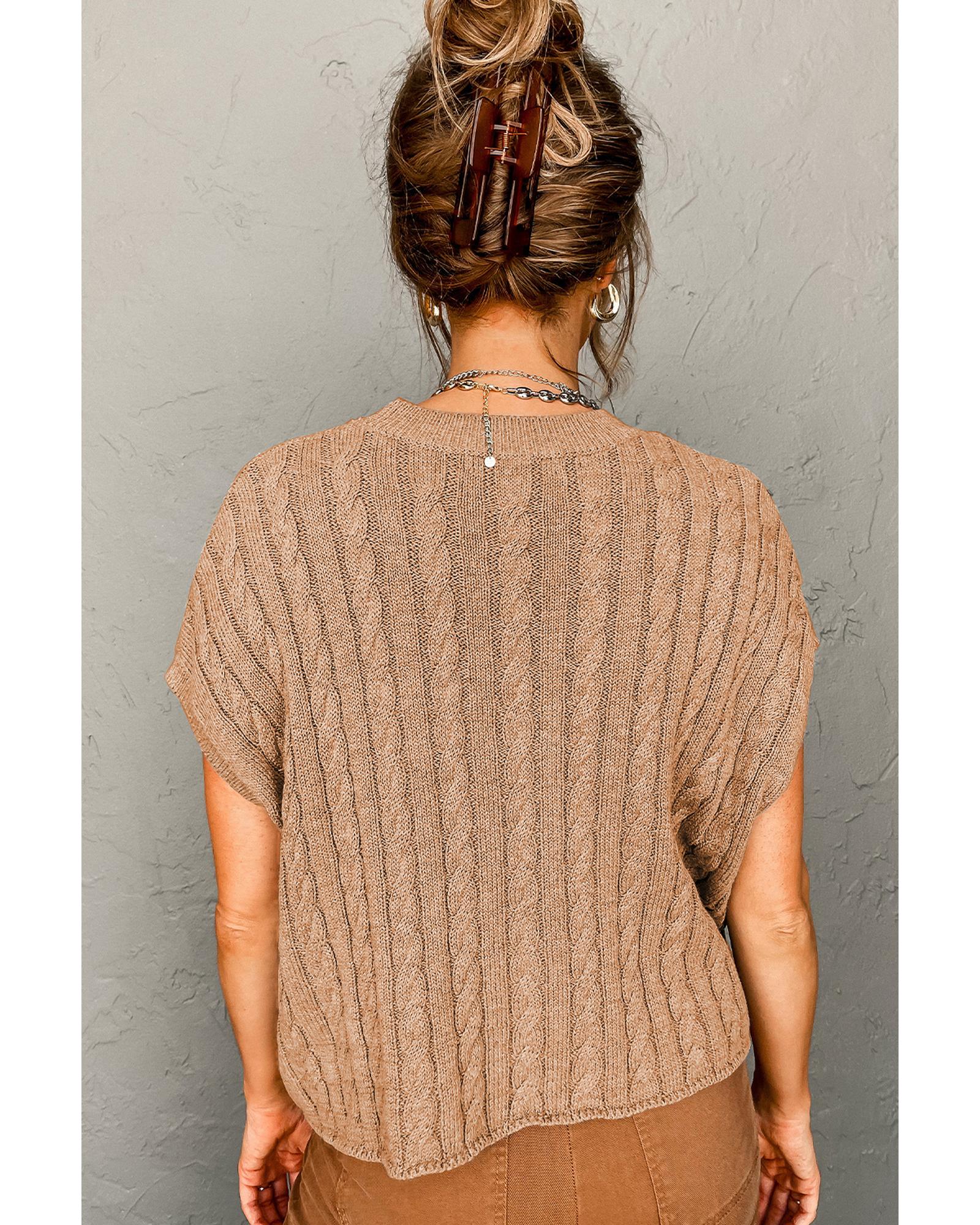 Light French Beige Crew Neck Cable Knit Short Sleeve Sweater – L