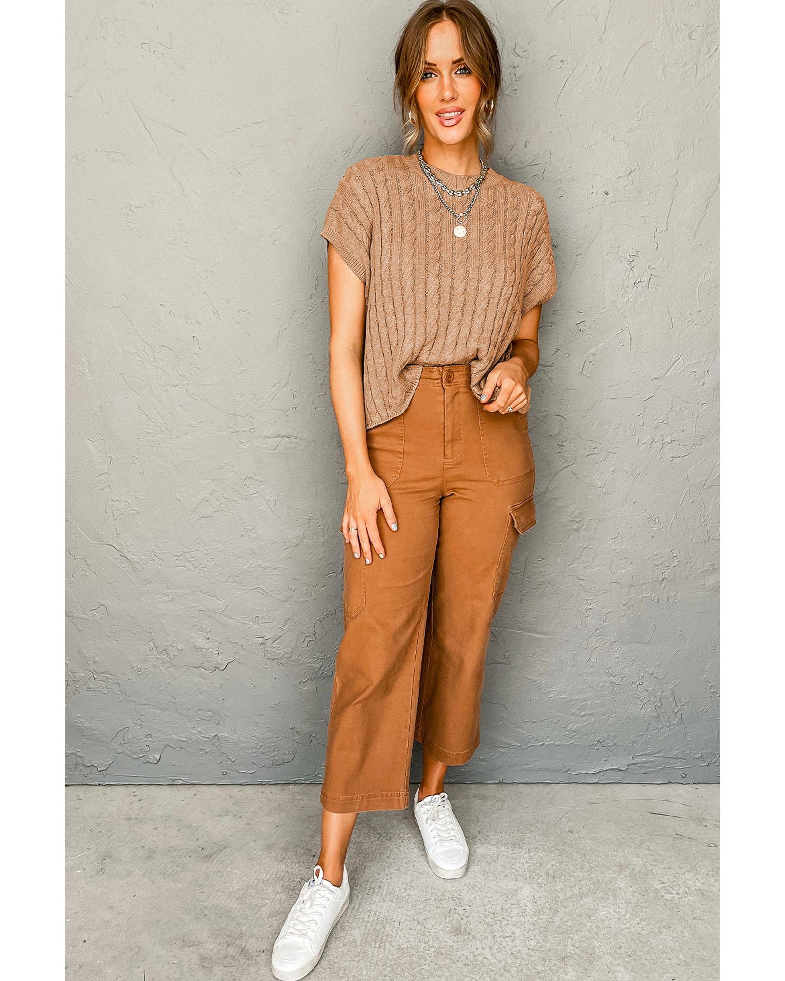 Light French Beige Crew Neck Cable Knit Short Sleeve Sweater – M
