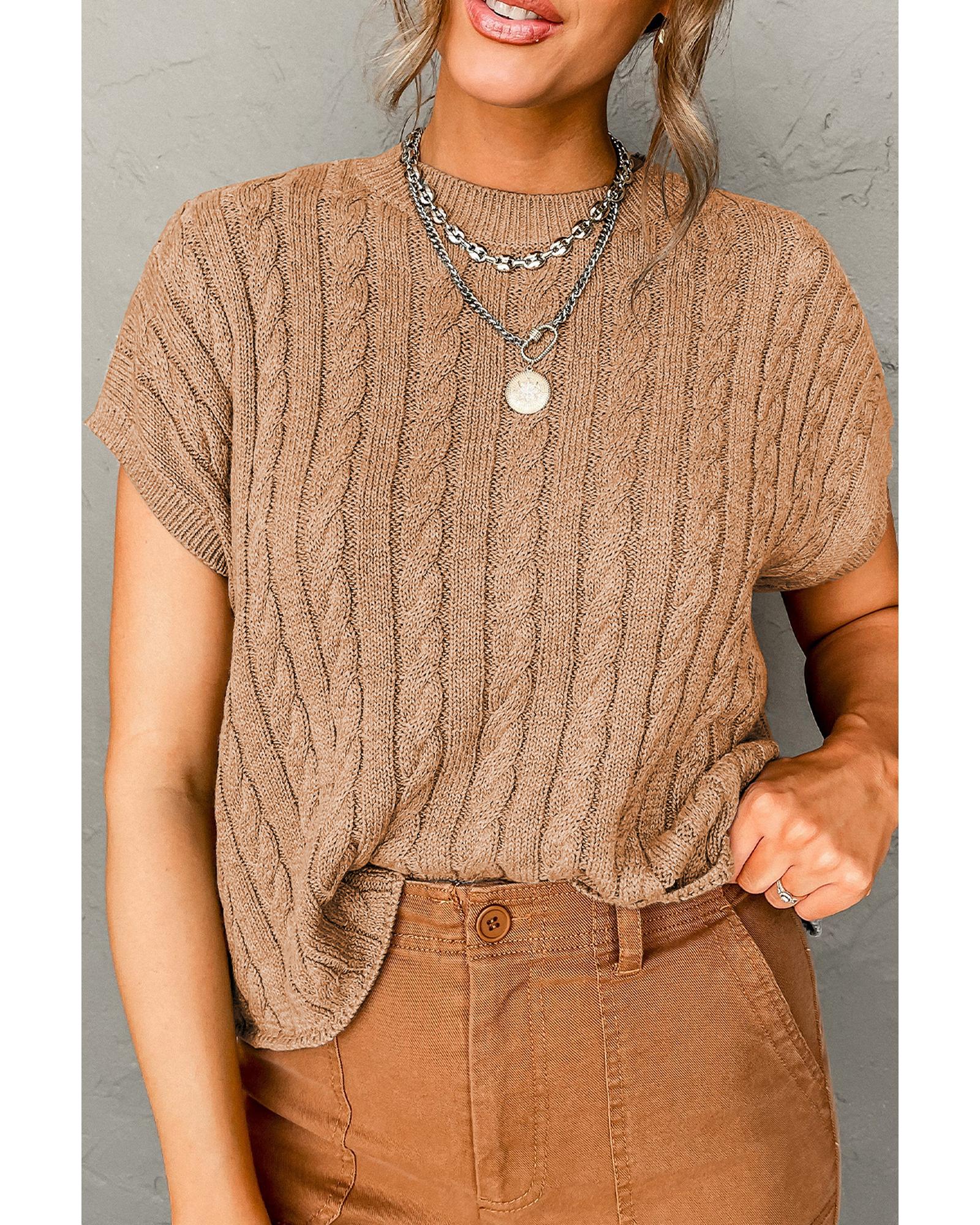 Light French Beige Crew Neck Cable Knit Short Sleeve Sweater – XL