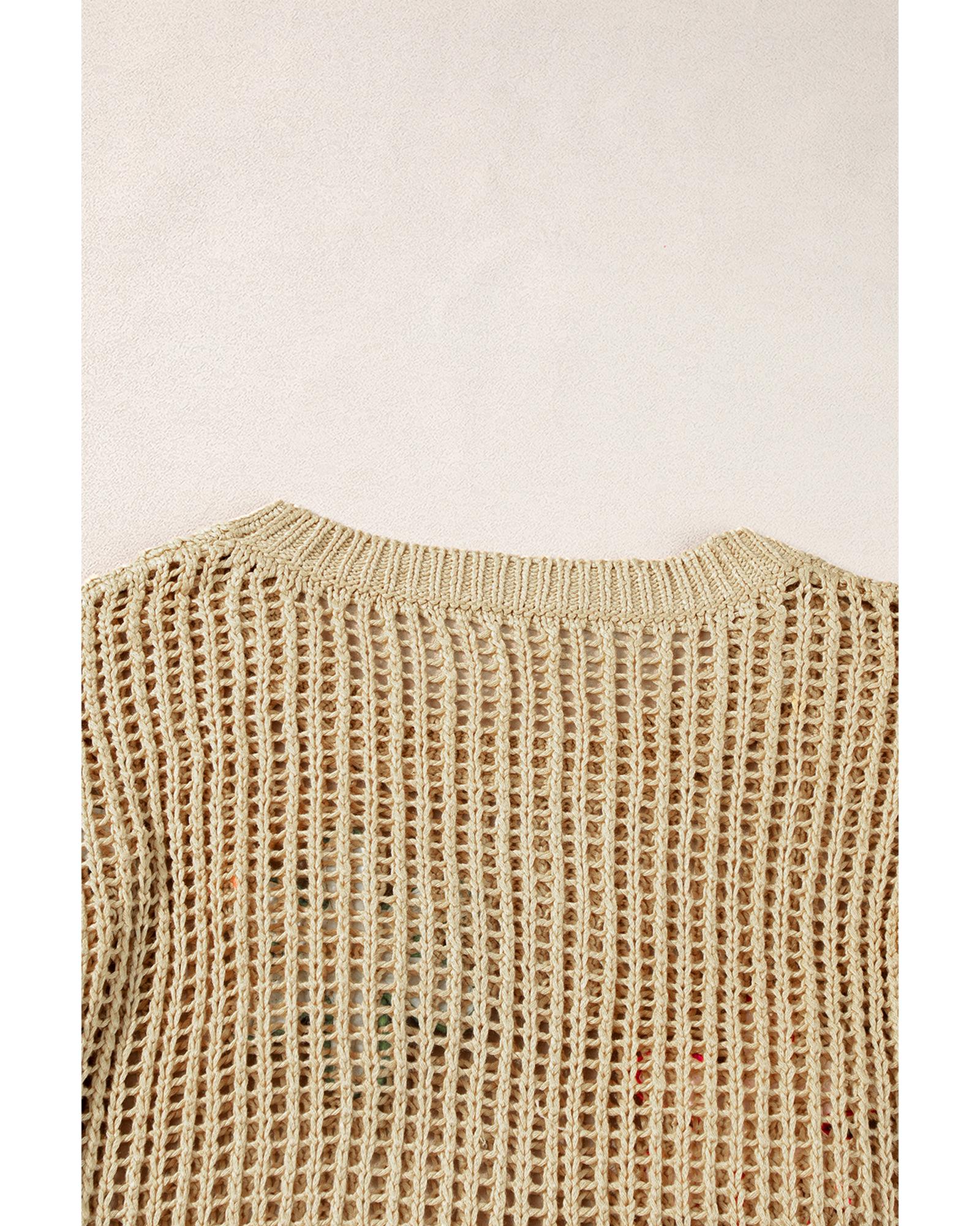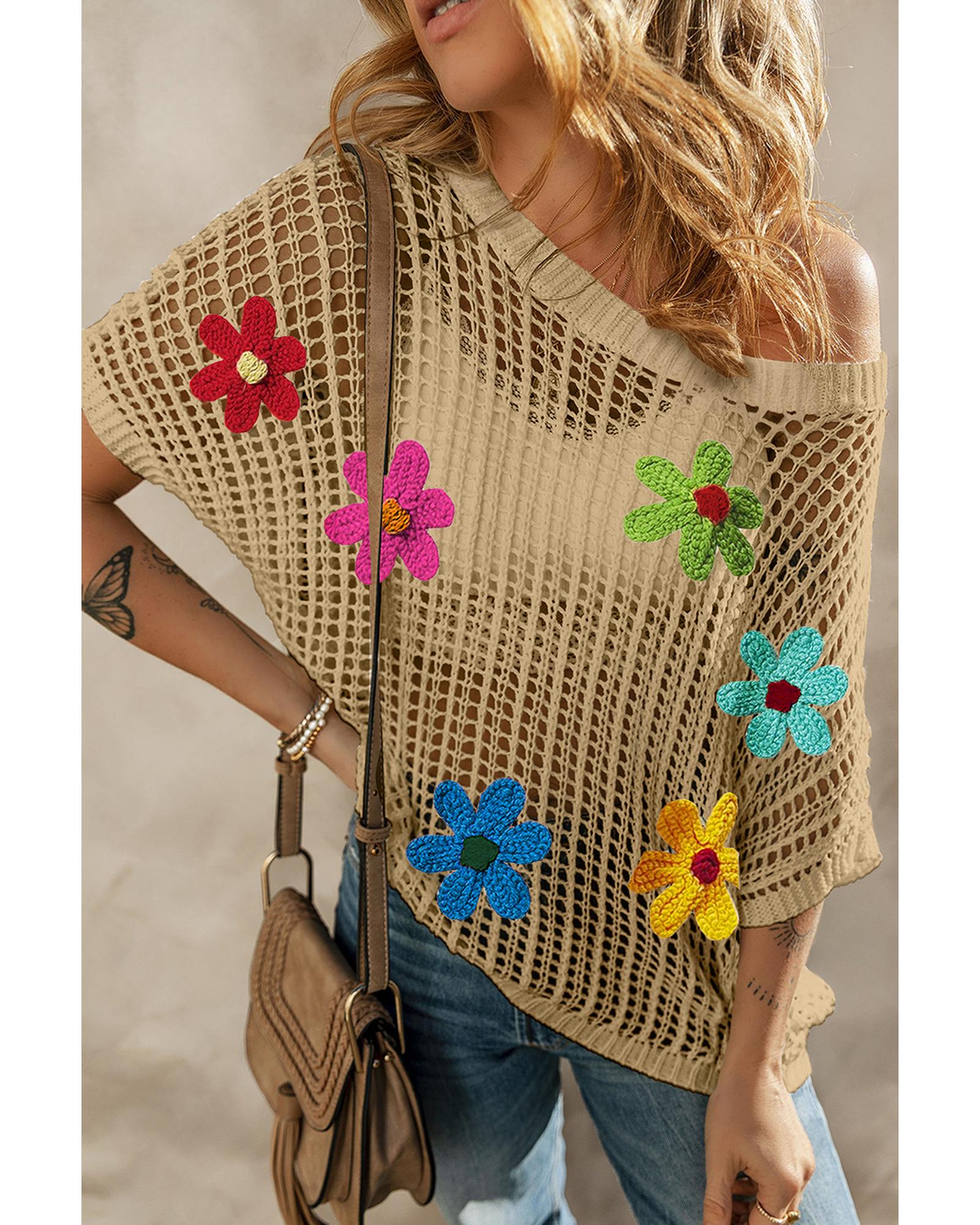 Light French Beige Crochet Flower Hollow-out Sweater T Shirt – M