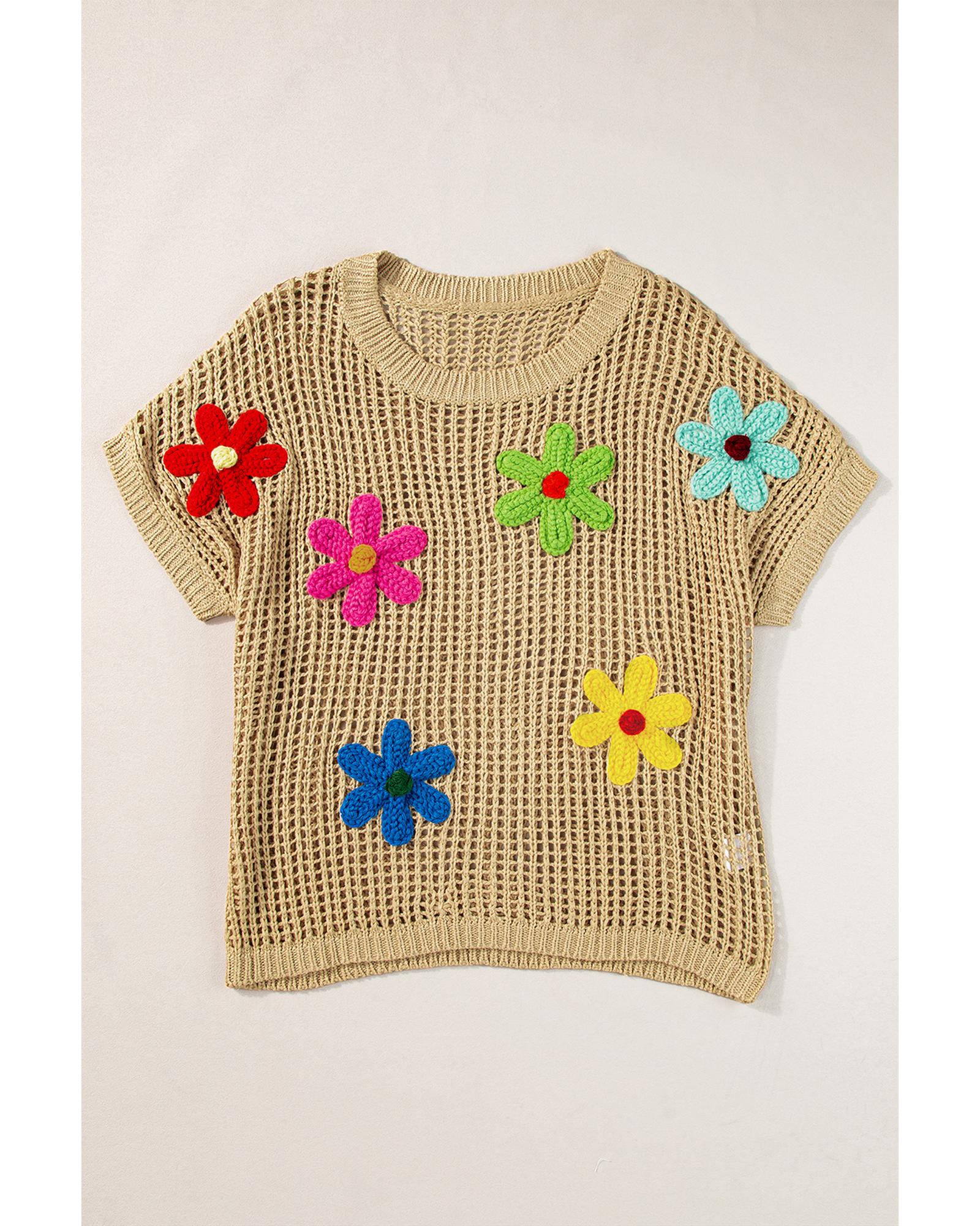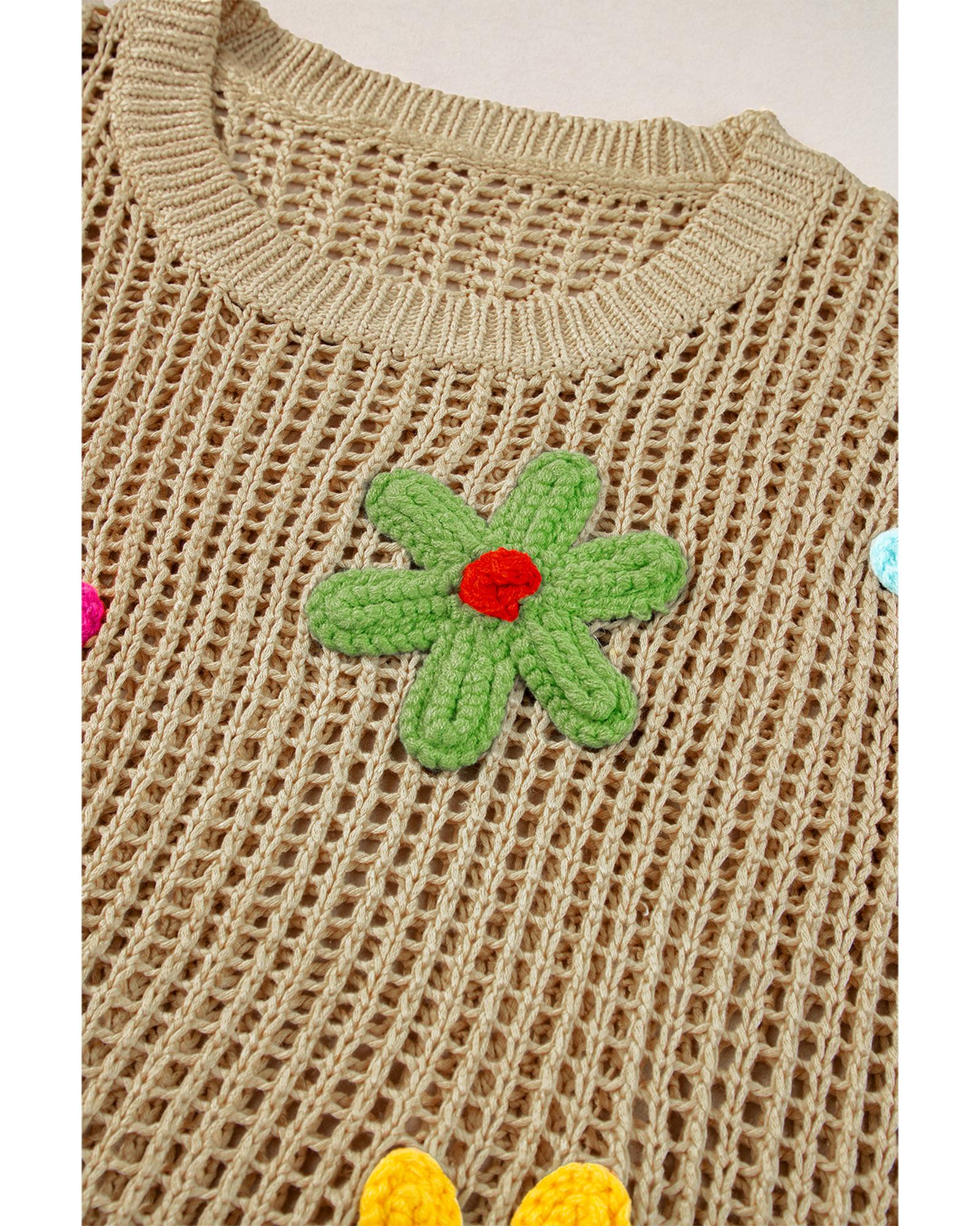 Light French Beige Crochet Flower Hollow-out Sweater T Shirt – XL