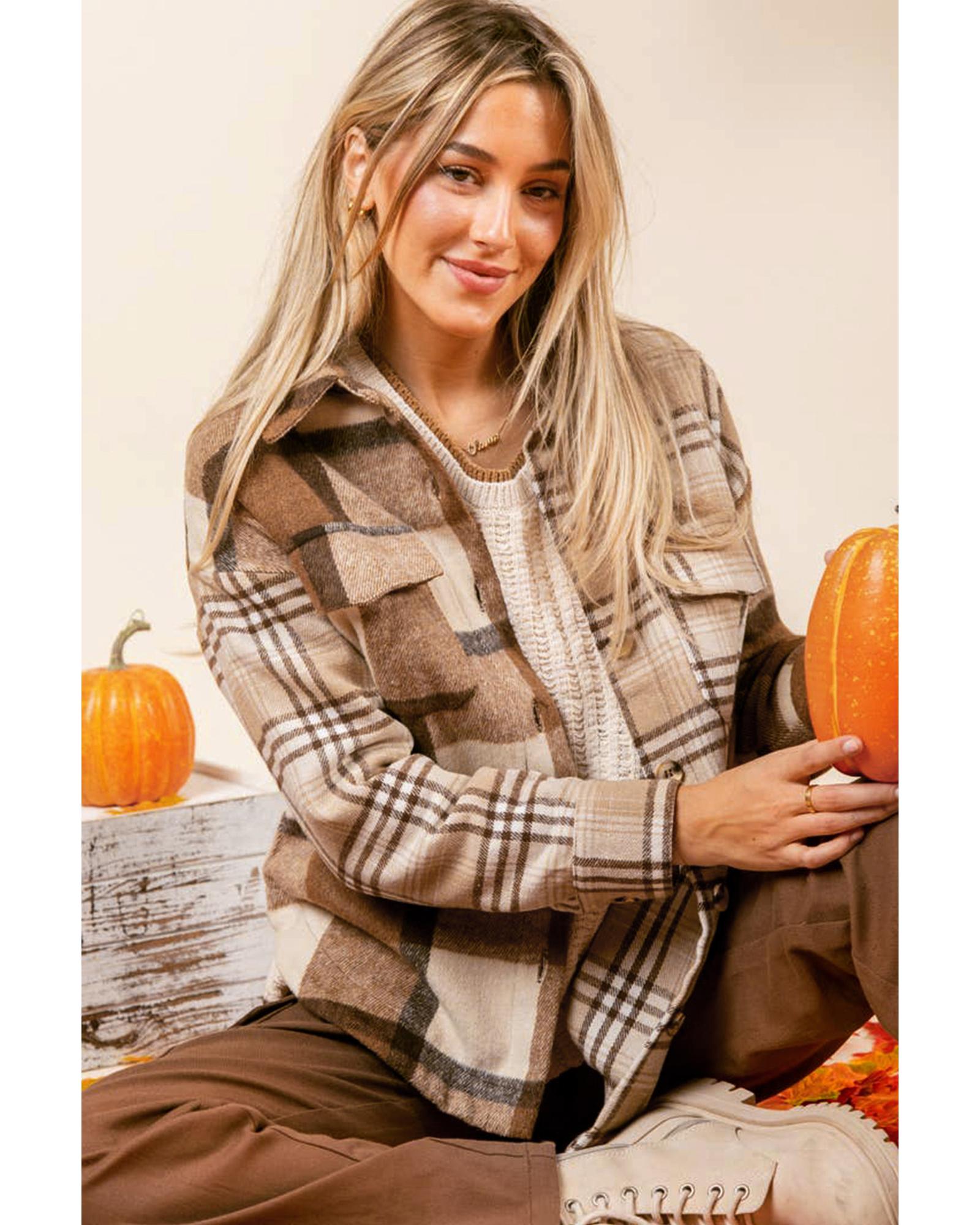 Light French Beige Flannel Plaid Double Flap Pocket Shacket – M